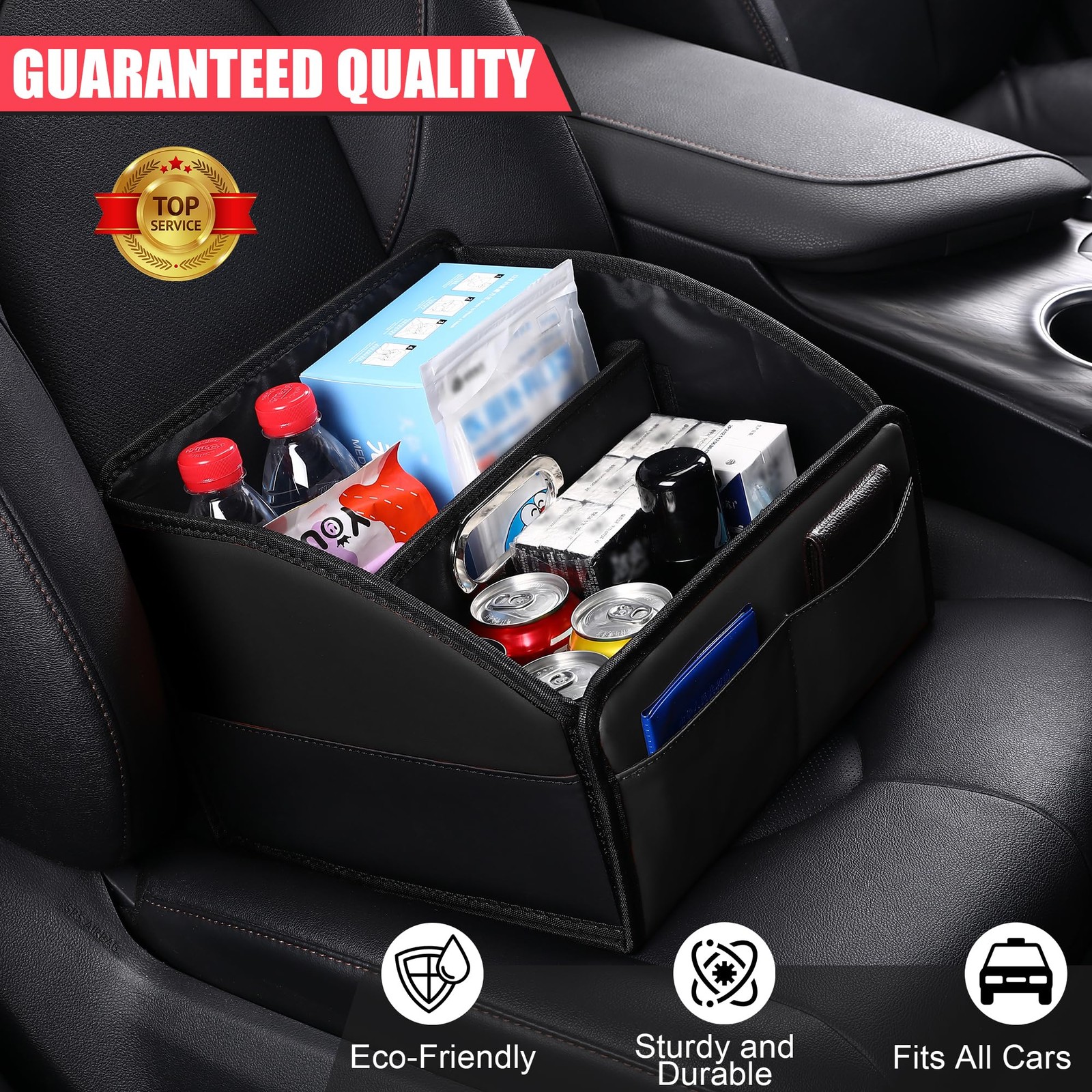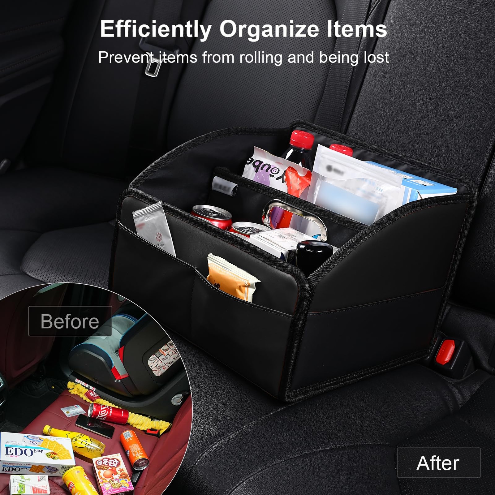 Car Storage Organizer Basket Keep your car organized with this premium Car Seat Storage Organizer, designed for use in cars, SUVs, RVs, vans, jeeps, and pickup trucks, etc. Perfect for busy parents, commuters, and road trip enthusiasts, it helps keep your car neat and your essentials within reach. This versatile front seat organizer box features multiple compartments, providing ample storage for snacks, drinks, toys, electronics, and other items. The sleek black design blends seamlessly into your car’s interior without drawing attention, ensuring a clean, discreet look. Crafted from high-quality black PU leather and durable stitching, this car organizer front seat is built to last. Its rigid sides and bottom provide solid support, even when fully loaded, and prevent deformation over time. This car caddy front seat with 6 spacious compartments, it can hold items like Emergency Tools, DVD binders, cups, pens, snacks, purses, sunglasses, water bottles, maps, shopping bags, and more, maximizing your car's seat space and keeping everything organized. The bottom plate is upgraded to support up to 22 lbs and ensures that your items stay securely in place. Featuring an easy-to-grip single-pull handle, it offers user-friendly functionality and comfort. The adjustable strap and buckle securely attach to the seatbelt, preventing the organizer from sliding around while in use. Installation is quick and effortless-simply place the organizer on the seat, floor, or trunk of your vehicle. It works perfectly on any flat surface. Cleaning is simple too-just wipe with a wet towel to maintain its pristine condition. Whether you're heading out for a road trip or just need a way to keep your daily essentials organized, this Car Seat Storage Organizer is a practical, space-saving solution for every vehicle 【FASHION STYLE & LARGE CAPACITY】 – front & backseat car organizer is measuring 12.6” x 11.5” x 9.1” Upgrade removable divide and sturdy Metal handle make it easy to move around. This car front seat organizer bear up to 22 lb items, the sleek design complements any car interior 【SPACE-SAVING & A MUST HAVE】 – This car seat organizer for kids have 6 compartments of storage, convenient storage for Toys, Tissues Box, Purse, Beverages and Snacks WITHIN EASY REACH. Car caddy has an adjustable strap buckle to secure it with your seatbelt, preventing sliding 【MULTI-FUNCTION FRONT SEAT ORGANIZERS AND STORAGE】– This car seat storage organizer is not only a car organizer, but also worked as Car trash can, take your eating on the go more convenient and safe. Also suitable for home, office. It's a good helper for home travel 【PREMIUM PU LEATHER & EASY TO CLEAN】 – front seat car organizer exterior/interior is made of Premium waterproof leather and wooden board. Three-layer sealing technology, durable. You can easily clean the dirt on the surface, mud, candy, milk with a wet towel, and also no longer be bothered by the muddy shoes and Umbrella in rainy day 【ADJUSTABLE BUCKLE STRAP & FOLDABLE DESIGN】 – Can be installed in multiple positions in the car to meet your different needs (Such Front seat, Back seat, Between seats, Floor, Trunk). Can be easily folded when not needed. TOP VEHICLE CAR ORGANIZERS AND STORAGE, Buy It Now, Keep Your Car Organized