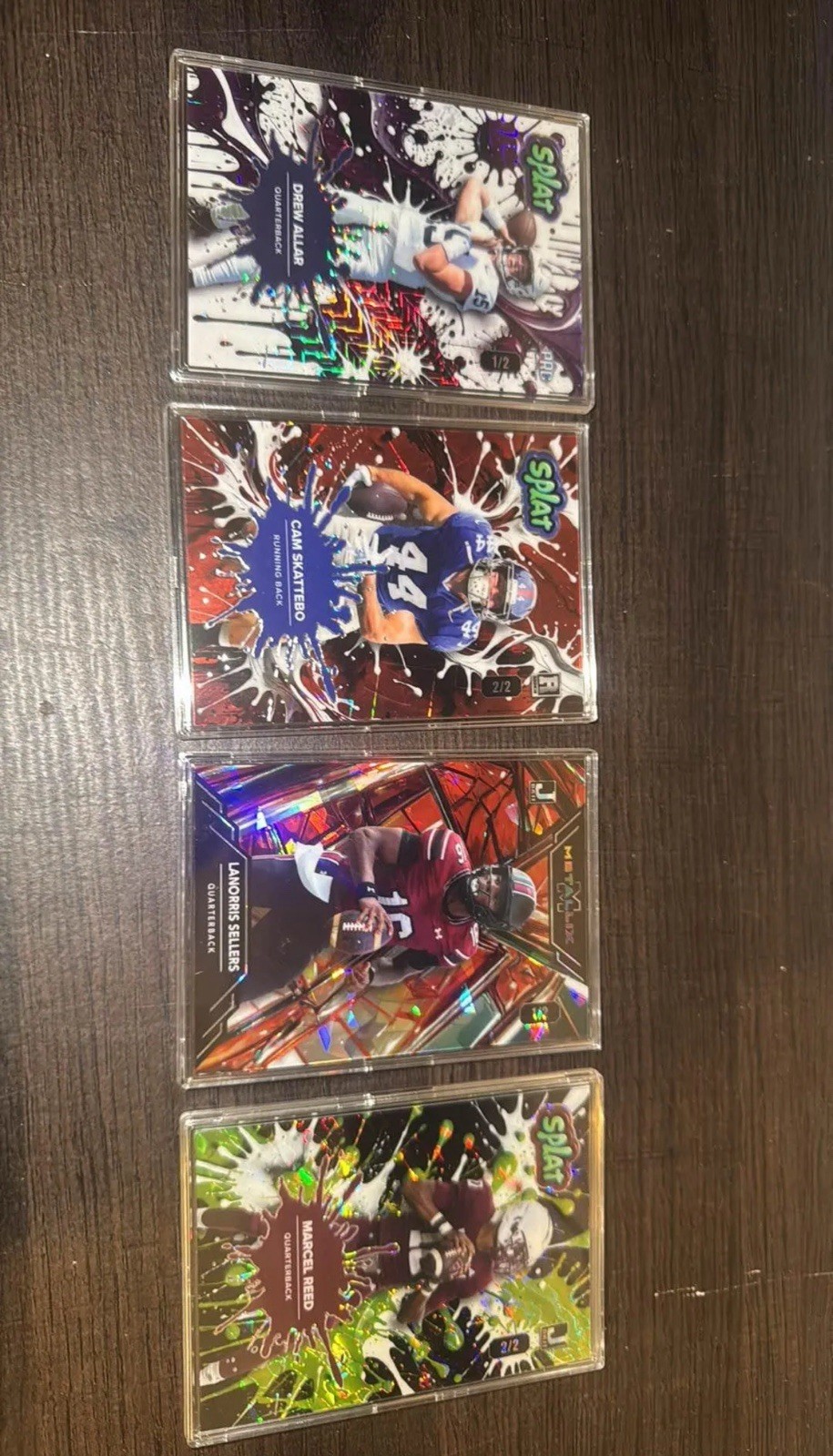 The 2025 Wildcard Splat/Metallix NFL Bundle offers 24 standard-sized football trading cards with special feature such as one-of-a-kind rookie cards, 1/1s /2s and so on. Manufactured by Wild Card in 2025, the cards are made of card stock and authenticated with a Leaf certification.