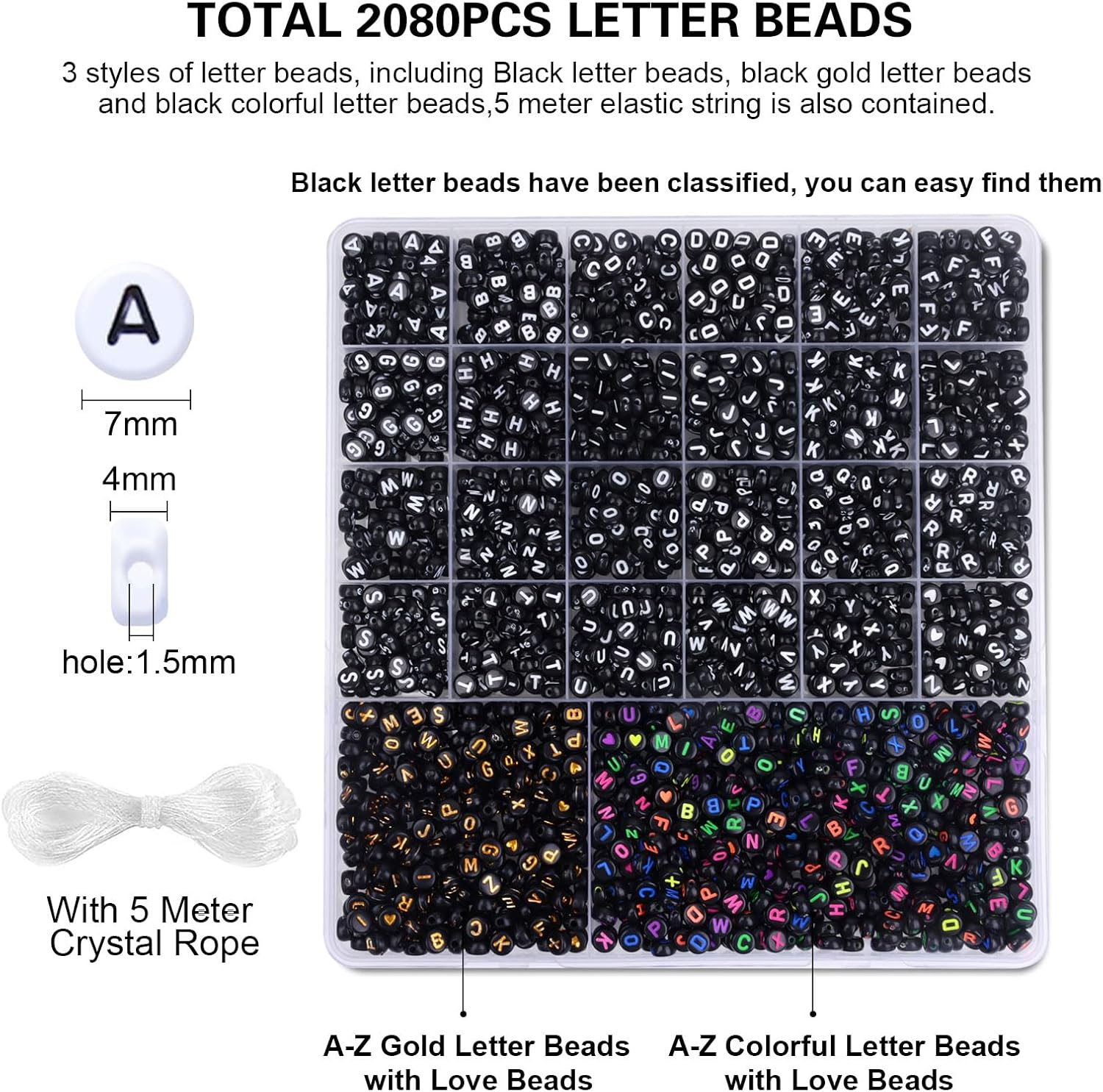 【Quantity and Style】A total of 2080 letter beads. 3 styles of black letter beads,5 meter elastic string is also contained. All of these helping you DIY a unique jewelry. 【Meaningful & Handmade Gifts】Making someone a letter friendship bracelet is a great way to show them how much you care for them. Pick the word you want to express from the A to Z letter beads and give your christmas thanksgiving gift exclusive meaning. 【Beads Methodically Sorted】The cute stuff letter beads have been carefully classified and stored in the containers, you can effortlessly complete any intricate beading. Say goodbye to wasting valuable time search alphabet beads. 【Clear Pattern】Each delicate pattern letter beads is made of acrylic material and advanced paint spray & grinding technology results in smooth beads. It can perfectly combine with clay beads, pony beads and colorful beads, widely used in jewelry making, name bracelets, necklaces, keychains, other decoration, accessories, wedding crafts, stage dresses and etc. These letter beads will add new creativity to your design. 【Enhance Intellectual Development】Beads kit can be used to sorting matching games and alphabet bead activities. Beading craft helps promote hand-eye coordination, intellectual and fine motor skills. Product Description