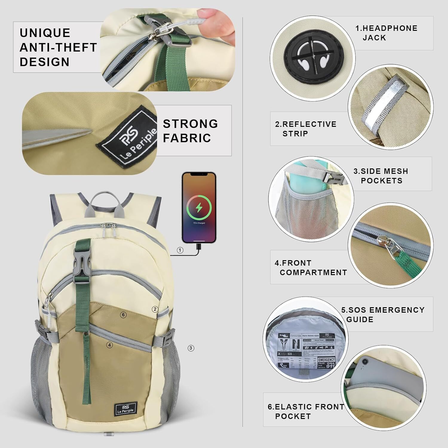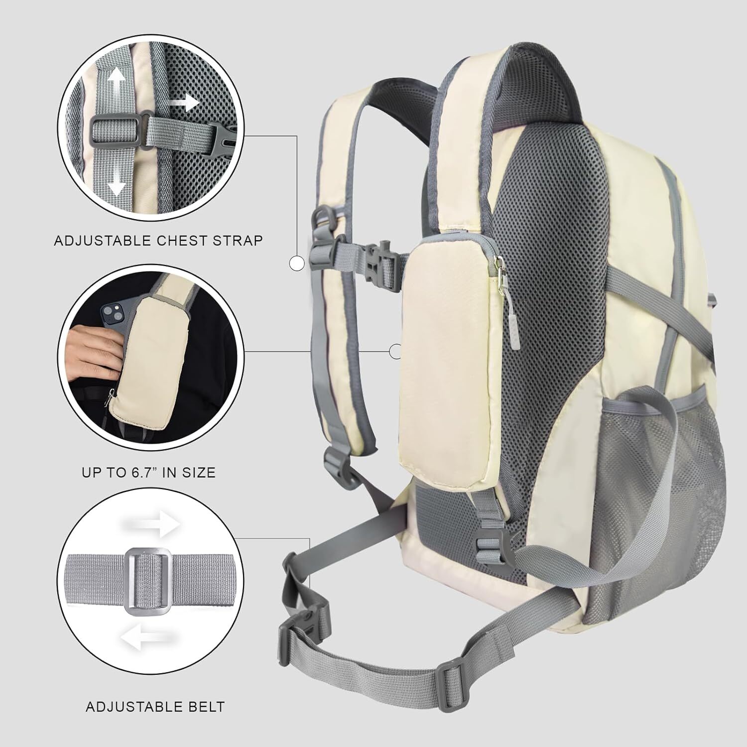 Product Description Small Hiking Backpack, 20L Lightweight Travel Backpack with Phone Pocket, Hiking Daypack for Women Men,Beige [Capacity&Dimensions]: The small hiking backpack boasts a spacious 20-liter capacity, perfect for everyday use and short trips. With dimensions of 10.3 inches by 7.4 inches by 16.9 inches and weighing just 1.4 pounds, it's compact and lightweight, making it easy to carry. [Multi Compartment]: The small hiking backpack features a elastic front Pocket and anti-theft Pocket for secure storage. The zippered pocket on the left shoulder strap allows easy access to your phone and can accommodate screens up to 6.7 inches.The laptop and iPad compartment, along with multiple storage pockets, offer organization and protection for your devices and belongings. [Comfortable Design]: The ergonomic back panel and mesh back padding ensure a comfortable and sweat-free carrying experience. Adjustable chest buckles and shoulder straps alleviate shoulder strain, providing a relaxed and comfortable journey. [Safety and Security]: Three reflective strips on the front enhance visibility in low-light or nighttime conditions. The small hiking backpack features a whistle buckle and a wilderness first aid guide, making it an ideal choice for outdoor activities. The tear-resistant and water-repellent fabric ensures durability and protection. [Practical Details]: The small hiking backpack is equipped with two side water bottle pockets for easy hydration. It also includes a headphone port and a key clip for convenient music enjoyment and key storage. About Us We are a reputable seller with many years of experience selling on eBay. Our goal is to provide high-quality products and excellent customer service. Shipping Items will be shipped within 1-3 business days when we received payment. (Orders are not processed on weekends & holidays) Tracking information will be sent once item is shipped. Delivery time depends on destination and other factors Item is shipped to ebay address. Leaving correct address can minimize delay. For international shipping and shipping to Guam, Hawaii and Alaska, Please contact us before placing the order. International buyers please note: Import duties, taxes and charges are not included in the item price or shipping charges. These charges are buyer’s responsibility. We will try our best to reduce the risk of the custom duties. Local pick-up is unavailable at the moment. Contact Us We reply any email messages within 1 business / working days(off-duty at weekend). If you do not get a response from us, then please check your junk or spam mailbox. Our Business hours: Mon-Fri 9:00-18:00, UTC/GMT +8 hours. Please contact us either by clicking "contact seller" in the "purchase history" section or simply click "ask a question" at the bottom of this page. If you are unsatisfied with our item or service, please contact us before leaving any feedback. We are committed to resolve all issues in a friendly and satisfactory manner.