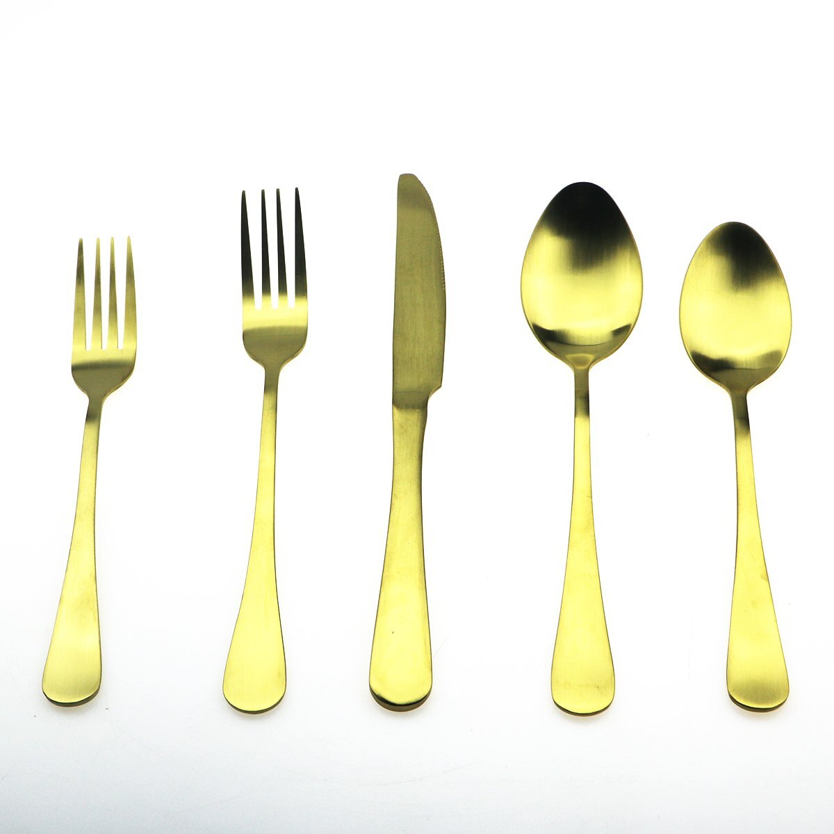 Specification: Totally 20 pieces a set, Dinner Knife + Dinner Spoon + Dinner Fork + Dessert Fork + Tea Spoon, 4 pieces of each. Top quality 18/10(304) stainless steel material for longer life use. Come with sample safe package with gift box. Knife Dimensions: Length: 25cm / 9.84 inch Weight: 100g / 3.52oz Dinner Spoon Dimensions: Length: 22cm / 8.66 inch Weight: 90g / 3.17oz Dinner Fork Dimensions: Length: 21.5cm / 8.45 inch Weight: 65g / 2.29oz Dessert Fork Dimensions: Length: 20cm / 7.87 inch Weight: 55g / 1.94oz Tea Spoon Dimensions: Length: 14.5cm / 5.7 inch Weight: 35g / 1.23oz 18/10 Stianless Steel Dishwasher Safe (No Harsh Detergents) Cofortable Use Feeling Great for Everyday Use Luxury Electroplate Titanium Gold, Safe for Human 20-Piece Flatware Dinner Knife, Dinner Spoon, Dinner Fork, Dessert Fork, Tea Spoon, 4 Piece of Each