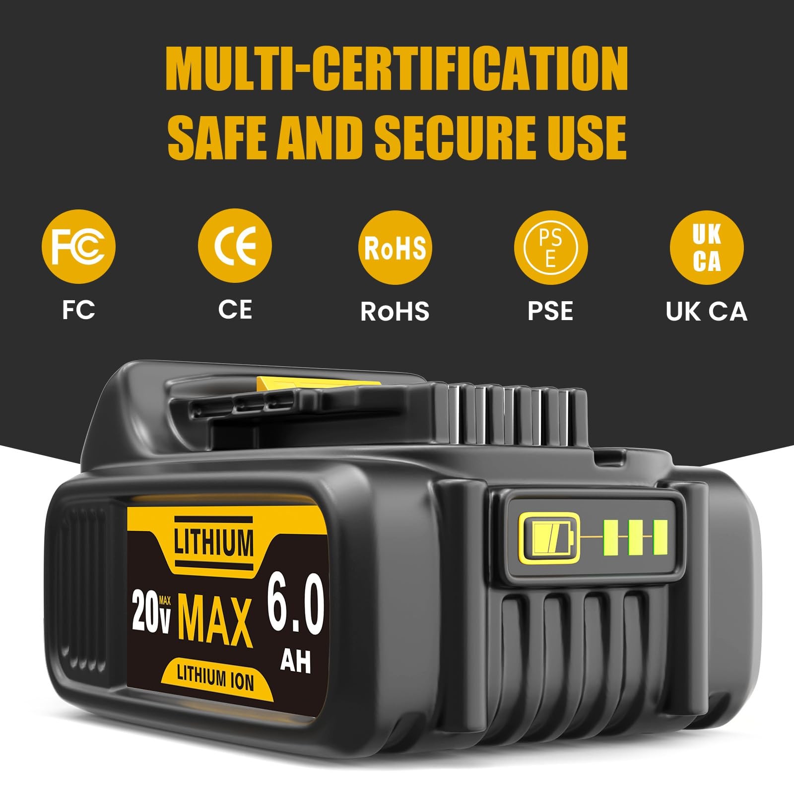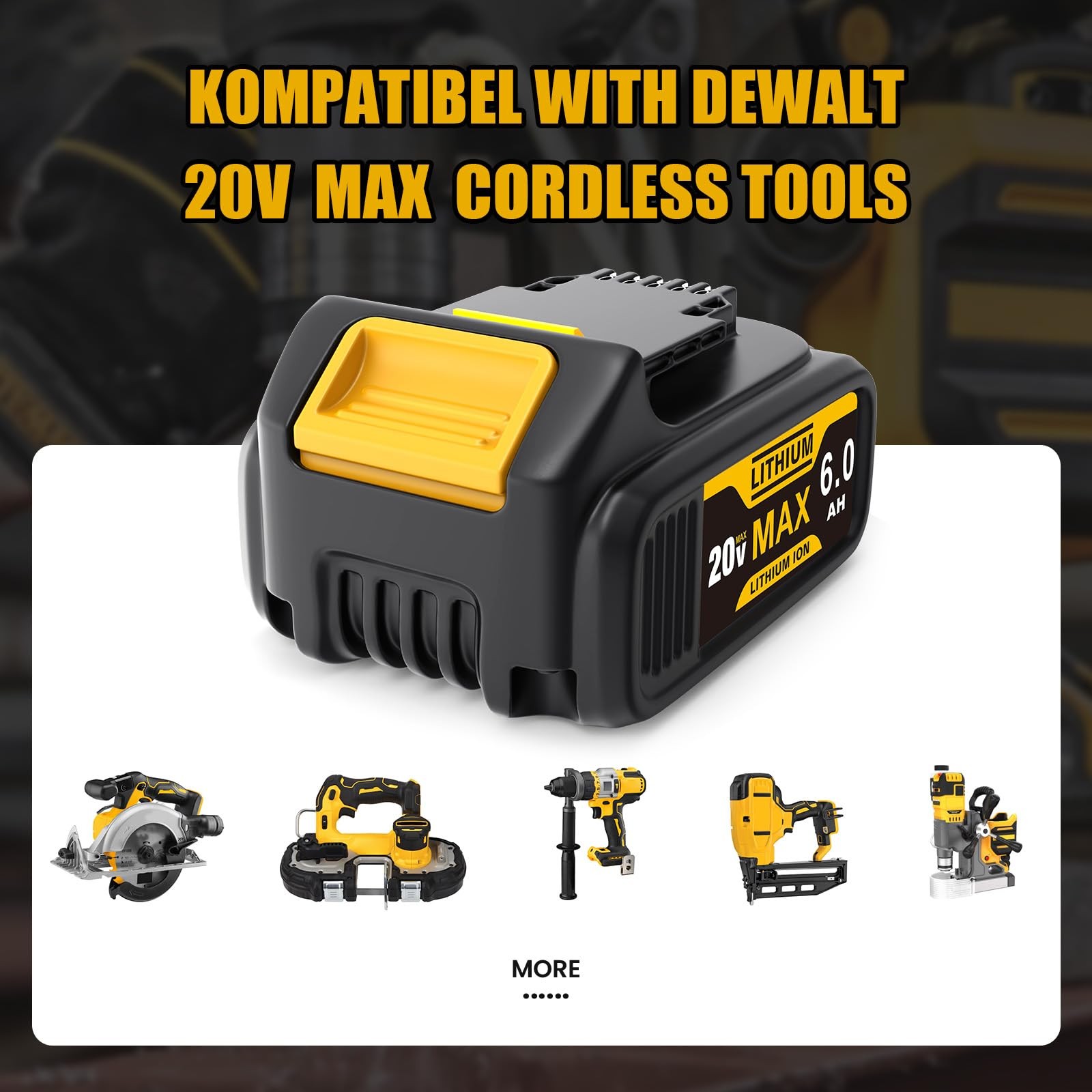 6000mAh Lithium-ion battery for Dewalt Batteries DCB200 DCB180 DCB181 DCB182 DCB184 DCB201 etc. Technische Daten: Tension: 20V max Performance: 120Wh Capacity: 6.0Ah / 6000mAh Batterietyp: Li-Ion Compatible Models DCD Series:DCD740, DCD740B, DCD780, DCD780B, DCD780C2, DCD780L2, DCD785C2, DCD785L2, DCD980L2, DCD980M2, DCD985B, DCD985L2, DCD985L2, DCD785C2, DCD780C2, DCD780B, DCD740C1, DCD740B DCF Series:DCF880C1-JP, DCF883B, DCF883L2, DCF885, DCF885B, DCF885C2, DCF885L2, DCF895B, DCF895C2, DCF895L2 DCF895L2, DCF895C2, DCF895B, DCF885L2, DCF885C2, DCF885B, DCF883L2, DCF883B, DCF880C1-JP, DCF883BZ DCG Series:DCG412, DCG412B, DCG412L2 DCS Series:DCS331B, DCS331L1, DCS331L2, DCS331N, DCS380B, DCS380L1, DCS381, DCS391B, DCS391L1, DCS393, DCS393, DCS391L2, DCS391L1, DCS391B, DCS381, DCS380L2, DCH214L2 【Premium Lithium-ion Core】Engineered with automotive-grade lithium-ion cells, 2packs 20V Max battery for DeWalt tools delivers 6000mAh ultra-high capacity for longer runtime compared to standard batteries for DeWalt tools, ensuring uninterrupted operation with compatible DCB107/DCB115 chargers. 【Rigorous Safety Certifications】UL/CE/FCC/RoHS certified with ISO9001 quality control, this 20V battery compatible with DeWalt tools features explosion-resistant cell structure and flame-retardant casing to meet OSHA power tool battery standards. 【Tool Matrix Compatibility】Precisely matches 20V Max XR battery systems for DeWalt tools: Compatible with DCD DCF DCG DCS series,DCB201 DCB201-2 DCB203 DCB204 DCB205 DCB206 DCB207 DCB205-2 DCB200-2 DCB200 DCB180 DCB181 DCB181-XJ N123283 N123282 DCB204-2 etc. 【Intelligent Charger Adaptation】Optimized charging algorithm for seamless pairing with DCB107 / DCB115 / DCB118 / DCB104 / DCB102 / DCB105 rapid chargers, achieving 80% charge in 90 minutes with temperature control technology. Perfect replacement for baterias 20V compatible with DeWalt tools. 【360° Protection System】Built-in IC chip with 6-layer safeguards: Overload/Overheat/Overcharge/Short-circuit/Deep discharge/Current fluctuation protection. Ideal for 20V battery replacements for DeWalt tools. 【Power Monitoring】20V replacement battery with the LED indicator show battery power. 3-LED Indicator allows you to quickly assess the remaining power and make informed decisions about when to recharge. A must-have feature for 20V batteries designed for DeWalt tools. 【Cold-Weather Optimization】Specialized electrolyte formula maintains stable discharge performance in -10°C~50°C environments, ideal for winter construction sites and high-temperature workshops. Perfect for 20V XR battery replacements compatible with DeWalt tools. 【Ergonomic Interface Design】Precision-molded copper alloy contacts with anti-spark coating, 5000+ insertion cycle rated. Gold-plated terminals ensure <0.01Ω contact resistance. Compatible with all 20V battery systems for DeWalt tools. 【Eco-Cycle Warranty】Includes 12-month performance guarantee with 600 charge cycles capacity retention ≥80%. Comes with recycling guide for expired batteries (EPA compliant). The ultimate choice for 20V Max battery replacements compatible with DeWalt tools.