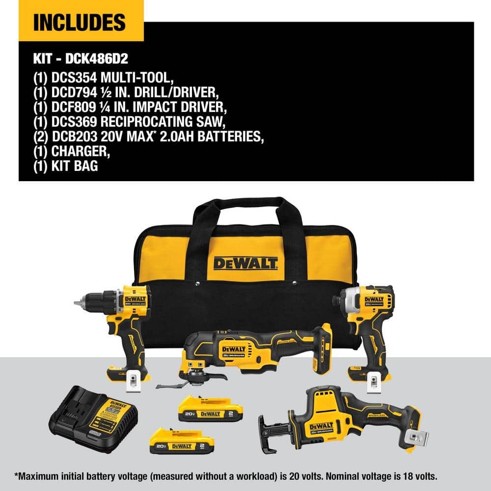 This ATOMIC Compact Series combo kit includes one 1/2 in. drill/driver, 1/4 in. impact driver, one-handed reciprocating saw, oscillating multi-tool, two 20V MAX* compact 2Ah batteries, charger, and contractor bag. The DCD794 is our shortest 20V MAX* drill/driver at only 5.88 in. (tool head length only) to access hard to reach areas. The DCF809 impact driver features a high-performance brushless motor that delivers 1,700 in-lbs of max torque. The DCS369 one-handed reciprocating saw cuts rapidly through various materials with 5/8 in. stroke length. The DCS354 Oscillating multi-tool is compact at only 11.2 in., and with its dual-grip variable-speed trigger, it can assist you in a wide variety of applications. Brand DEWALT Type Power ... Comfort Home ATOMIC 20-Volt Lithium-Ion Cordless Brushless Combo Kit (4-Tool) with (2) 2.0Ah Batteries, Charger and Bag This ATOMIC Compact Series combo kit includes one 1/2 in. drill/driver, 1/4 in. impact driver, one-handed reciprocating saw, oscillating multi-tool, two 20V MAX* compact 2Ah batteries, charger, and contractor bag. The DCD794 is our shortest 20V MAX* drill/driver at only 5.88 in. (tool head length only) to access hard to reach areas. The DCF809 impact driver features a high-performance brushless motor that delivers 1,700 in-lbs of max torque. The DCS369 one-handed reciprocating saw cuts rapidly through various materials with 5/8 in. stroke length. The DCS354 Oscillating multi-tool is compact at only 11.2 in., and with its dual-grip variable-speed trigger, it can assist you in a wide variety of applications. Item Specifics Brand DEWALT Type Power Tool Shipping 2. We provide three kinds of shipping for choice. Shipping way depend on delivery address. Returns If an unit is received defective, of course we take it back or replace it. If the unit is received as expected, we must charge for our expenses if you want to send it back. We have to charge for the work of handling, retesting and restocking. Contact Us Dear buyer, Thank you for visiting my store! Our warehouses are located in many regions around the United States. According to the customer's delivery address. Use USPS/UPS/DHL logistics transportation service. Prioritize the best quality logistics solutions to transport packages. Ensure package delivery time, At the same time. Have any after-sales problems, Feel free to contact us. At your service Comfort Home DESCRIPTION PAYMENT SHIPPING RETURN POLICY CONTACT US ATOMIC 20-Volt Lithium-Ion Cordless Brushless Combo Kit (4-Tool) with (2) 2.0Ah Batteries, Charger and Bag This ATOMIC Compact Series combo kit includes one 1/2 in. drill/driver, 1/4 in. impact driver, one-handed reciprocating saw, oscillating multi-tool, two 20V MAX* compact 2Ah batteries, charger, and contractor bag. The DCD794 is our shortest 20V MAX* drill/driver at only 5.88 in. (tool head length only) to access hard to reach areas. The DCF809 impact driver features a high-performance brushless motor that delivers 1,700 in-lbs of max torque. The DCS369 one-handed reciprocating saw cuts rapidly through various materials with 5/8 in. stroke length. The DCS354 Oscillating multi-tool is compact at only 11.2 in., and with its dual-grip variable-speed trigger, it can assist you in a wide variety of applications. Item Specifics Brand : DEWALT Type : Power Tool Payment Shipping Returns Contact Us 2. We provide three kinds of shipping for choice. Shipping way depend on delivery address. If an unit is received defective, of course we take it back or replace it. If the unit is received as expected, we must charge for our expenses if you want to send it back. We have to charge for the work of handling, retesting and restocking. Dear buyer, Thank you for visiting my store! Our warehouses are located in many regions around the United States. According to the customer's delivery address. Use USPS/UPS/DHL logistics transportation service. Prioritize the best quality logistics solutions to transport packages. Ensure package delivery time, At the same time. Have any after-sales problems, Feel free to contact us. At your service All rights reserved. Shop Category Store Home Other Hot Item New List Item Help & Info Payment Policy Shipping Policy Return Policy FAQ About Us On Jul 8, 2025 at 09:22:04 PDT, seller added the following information: