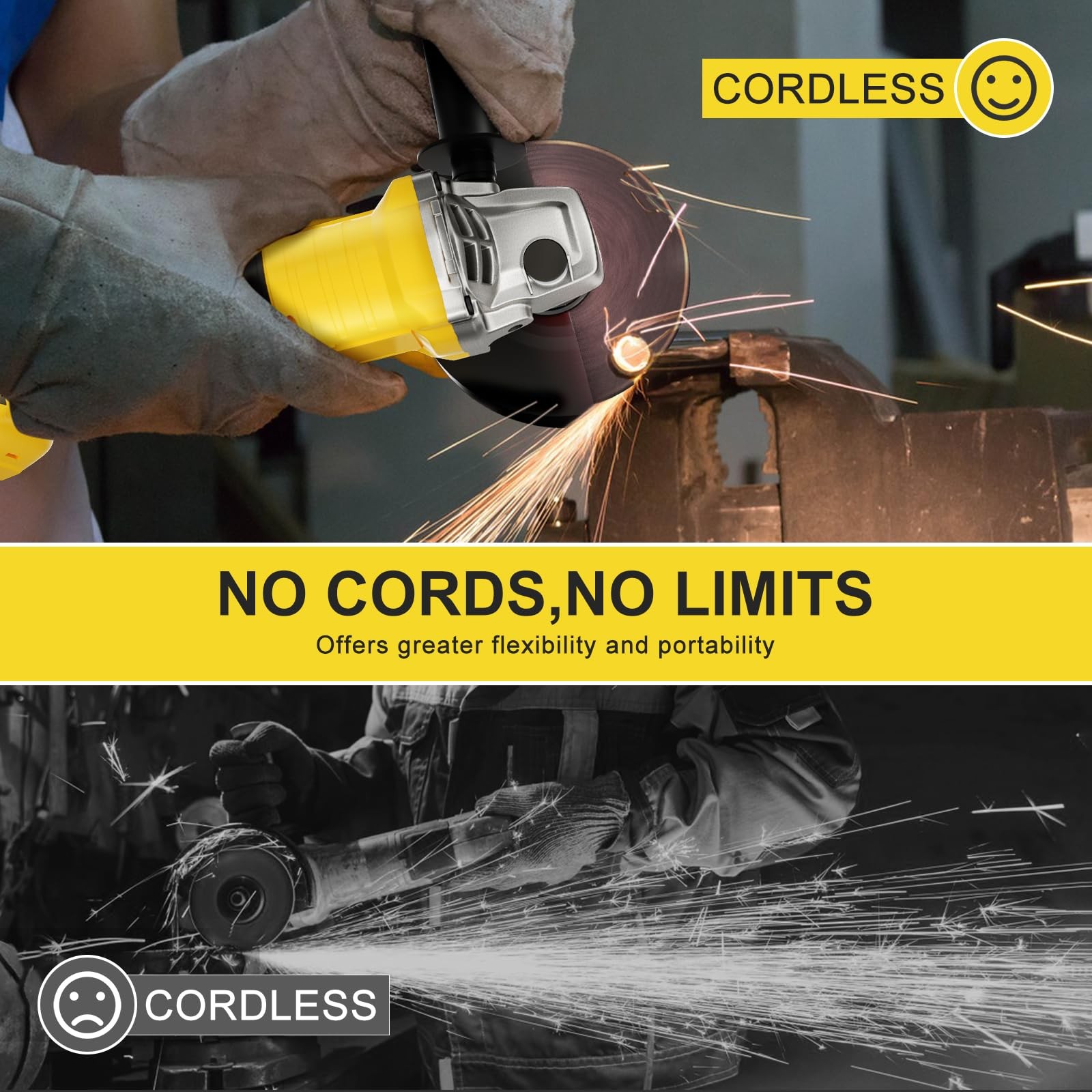 Angle Grinder 【Cordless Grinder & 3-Speed】Powered by DeWalt 20V & 60V Flex li-ion batteries (Battery NOT Included). We focus on providing reliable tools. If you already have a battery and charger before, you can save money on batteries and chargers.The 3-speed variable speed can be changed in the range of 5,000-10,000 RPM, which can satisfy your needs in every scenario. 【Efficient Brushless Motor】 20V Angle Grinder Brushless Motor provides up to 10,000RPM, longer life, more power, less battery energy loss, lower noise level of machine operation and safer working conditions. Say goodbye to traditional carbon brush motors and experience a higher level of grinding performance. 【User Friendly Design】 This 4-1 / 2 inch grinder tool is faster with a spindle lock that allows you to change the wheel disk. And the handle is adjustable to accommodate both left-handed and right-handed users. The protective cover of the side grinder will prevent sparks and metal shavings during use to protect you from injury. 【Widely Applications】 Whether you are a professional contractor or a DIY enthusiast, this cordless grinder is the perfect tool for your cutting and grinding needs. Equally suitable for metal cutting, surface treatment, polishing wood, stripping coatings, and smoothing, grinding, and lapping tasks on a wide range of materials such as tile, stone, concrete, brick, and more. 【Safety & Customer Service】 With double insulation protection to ensure user safety. If you have any questions about metal grinder, please contact our Customer Service team. We will do our best to solve your problems. In case of quality problems, we also offer new replacements instead of repairing within 12 months.