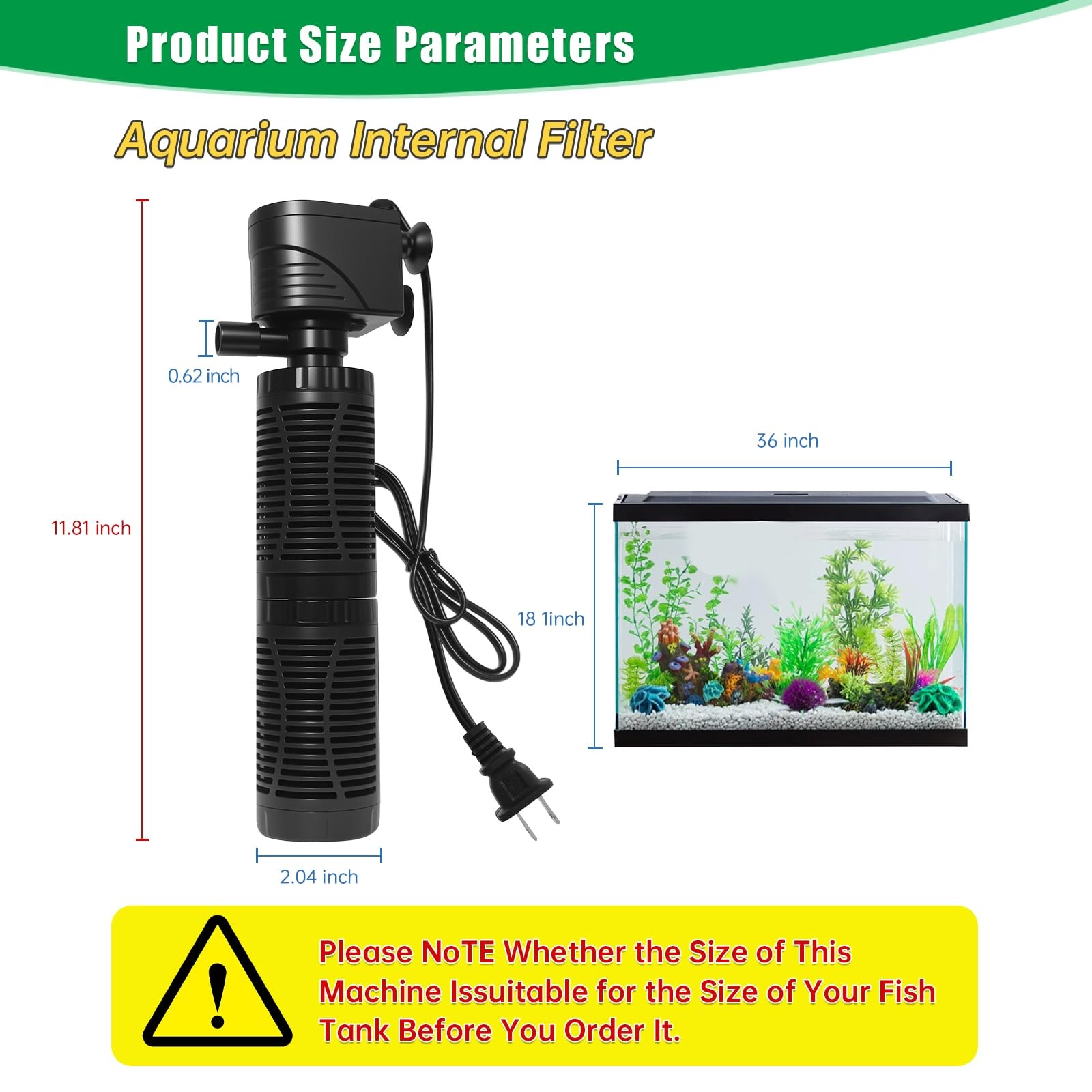 4-in-1 AquaPower Filter System All-in-one solution for filtration, aeration, circulation & wave action|20W energy-efficient motor|370 GPH high flow rate|Ideal for 50–120 gallon freshwater or saltwater tanks → 3-stage transparent canister with dual-layer dense foam captures waste, algae & odors — washable & reusable → OxygenBoost Vortex Technology increases oxygen exchange by up to 30% via dual-bubble and surface agitation → Fully submersible design, ultra-quiet (<35dB) with anti-vibration suction cups | Safe for low water levels Effortless Maintenance Quick-release snap design|Open-access canister|Media changes in under 1 minute Top Advantages ✓ 2X more filter media contact area → extended filter life ✓ Cost-effective — eliminates the need for a separate air pump ✓ Transparent housing lets you check filtration at a glance Important: Not recommended for turtle or reptile tanks. 4-in-1 High-Performance Aquarium Filter for Clean, Healthy Water: Measuring 11.9" × 2.3", this 20W internal filter integrates water circulation, oxygenation, surface agitation, and filtration in one compact design. With a powerful 370 GPH flow rate, it supports 50–120 gallon freshwater or saltwater aquariums. Not suitable for turtle or reptile habitats. Quiet Operation, Fully Submersible Design (<35dB): Built with a low-noise motor and anti-vibration suction cups, this sponge filter delivers quiet performance — ideal for bedrooms, offices, or other peaceful environments. Fully submersible and designed for flexibility, it also supports lower water levels for creative tank setups. Cost-Effective & Reusable Filtration: Includes 2 additional sponge layers and a built-in waste container to capture debris, algae, and odors. The washable sponges are reusable, and the filter media can be easily swapped to match your setup — reducing the need to replace the entire filter unit frequently. Tool-Free Cleaning & Maintenance: The transparent, 3-stage housing makes it easy to inspect and clean. Just twist off the top cap, remove the sponge, rinse, and reassemble — all without tools. Dual-Layer Safety Design for All Tank Layouts: Fine mesh intake prevents small fish and shrimp from being sucked in, ensuring safe operation. The double-layer filter system allows you to mix and match filter media for better performance. Energy-efficient and low-noise, it provides crystal-clear water with minimal maintenance effort.