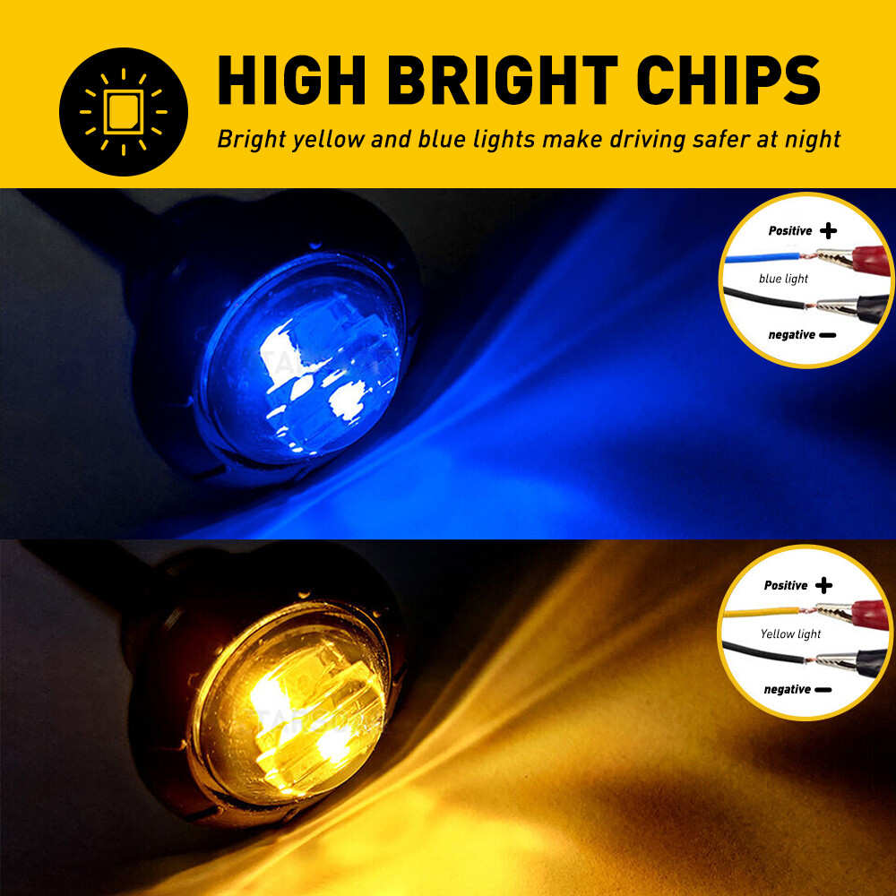 These LED side marker lights are fantastic! The amber and blue combo looks sharp, and the brightness is impressive—great for visibility and safety. The waterproof design (IP67) holds up in rain or fog, and the compact 3/4" size fits perfectly on trucks, trailers, and more. Super durable with a long lifespan, and the clear lens keeps the colors vibrant. Easy to install and way better than cheaper options. Highly recommend for anyone needing reliable, high-quality marker lights!