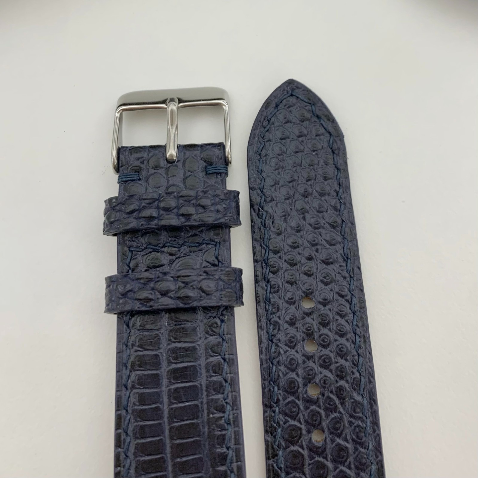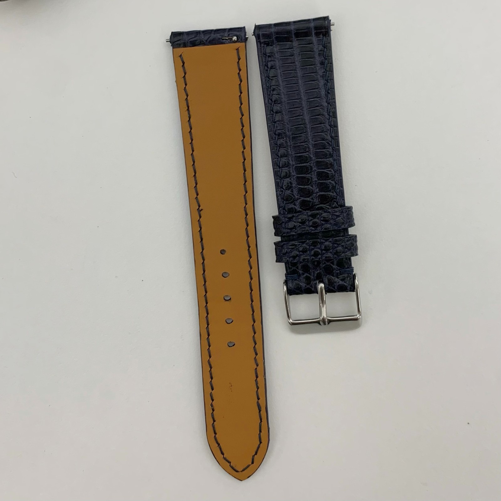 - Color: Navy Blue - Exterior material: Genuine Lizard leather - Interior material: Genuine cowhide - Band Size : Lug width 20mm / Buckle width 18mm - Length: long band 125mm - short band 75mm - Thickness: 2mm - 2mm - The strap comes with : 1 Watch strap + 1 Silver Buckle + 2 Quick Releases We have always been tried to provide the best service and reliable products for every customer. However, accidents may happen sometimes. Could you please contact us to solve any issues before leaving feedback. If having any question, please feel free to contact us by ebay message center.