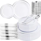 210 Piece Silver Plastic Dinnerware Set for 30 Guests, Plastic Plates for Party, Include: 30 Dinner Plates, 30 Dessert Plates, 30 Pre Rolled Napkins with Silver Silverware and 30 Cups WHAT YOU GET - 210pcs silver party plates sets for 30 guests with 30 " dinner plates, 30 " salad plates, 30 paper napkins, 30 9oz cups, 30 knives, 30 forks, and 30 spoons IDEAL FOR PARTIES - With plastic plates for party, you can easily host a party without worrying about the cleanup at the end. You can throw them in the trash after use. These silver plastic party plates are great for weddings, holidays, baby showers, business parties, Thanksgiving, Halloween, and Christmas dinners STURDY & DURABLE - These heavy-duty party plates and cups and napkins sets are made of hard plastic and are thick enough to avoid deformation or breaking from plates, knives, and forks. They can handle hot, cold, and wet food without leaks or spills BPA FREE - These disposable plates and napkins party supplies are made of food-grade, reusable plastic that is non-toxic and 100% BPA-free. If you need to reuse the wedding plates with silver rim, simply wash these party supplies with water. Note: These party plates aren't recommended to be placed in the microwave or dishwasher SINCERE SERVICE: If you have any unpleasant shopping experience about our plastic plates, welcome to contact me by , we will give your reply as soon as possible