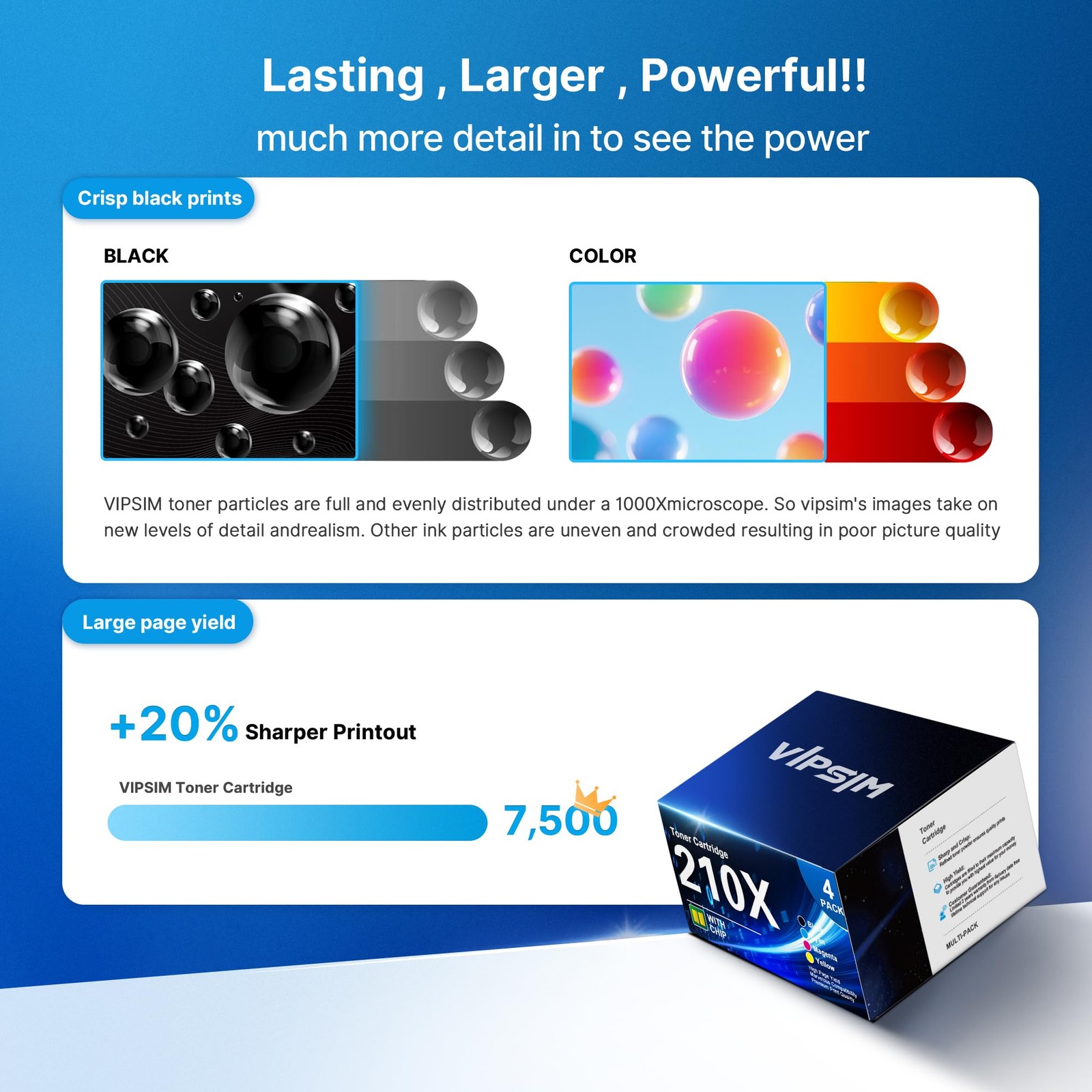210X Toner Cartridges 4 Pack: Replacement for HP 210A Toner Cartridges - for HP 210X Work with HP Color Laserjet Pro MFP 4301fdw 4301fdn 4201dw 4201dn 4301 Series Printer | 210X W2100X ; With Smart Chips: 210X toner cartridge replacement for hp 210x toner cartridges hp 210x is equipped with smart chips. No need to transfer OEM chips from hp 210a or hp 210x and ensure great compatibilty for HP 210A Toner Cartridges ; Compatible with Printer: for hp color laser jet pro mfp 4301fdw, MFP 4301dw, MFP 4301fdn, Color Pro MFP 4201dw 4201dn series printer. Replacement for hp color laserjet pro mfp 4301fdw toner cartridges ; High Page Yield: Up to 7,500 pages per 210X W2100X Black toner. Up to 5,500 pages per 210X Color toner, based on 5% coverage, Letter/A4, high yield Version replacement for hp 210a toner cartridges ; Package Contents: 210x toner cartridges 4 pack including 1 X 210A Black, 1 X 210X Cyan, 1 X 210X Magenta, 1 X 210X Yellow and 1 X User Guide ; Excellent Performance: 210X toner replacement for hp 210a toner cartridges hp 210x deliver superior printing results with vivid colors and clear prints. Save time by avoiding common printing problems such as streaks, smudges, and leaking With Smart Chips: 210X toner cartridge replacement for hp 210x toner cartridges hp 210x is equipped with smart chips. No need to transfer OEM chips from hp 210a or hp 210x and ensure great compatibilty for HP 210A Toner Cartridges Compatible with Printer: for hp color laser jet pro mfp 4301fdw, MFP 4301dw, MFP 4301fdn, Color Pro MFP 4201dw 4201dn series printer. Replacement for hp color laserjet pro mfp 4301fdw toner cartridges High Page Yield: Up to 7,500 pages per 210X W2100X Black toner. Up to 5,500 pages per 210X Color toner, based on 5% coverage, Letter/A4, high yield Version replacement for hp 210a toner cartridges Package Contents: 210x toner cartridges 4 pack including 1 X 210A Black, 1 X 210X Cyan, 1 X 210X Magenta, 1 X 210X Yellow and 1 X User Guide Excellent Performance: 210X toner replacement for hp 210a toner cartridges hp 210x deliver superior printing results with vivid colors and clear prints. Save time by avoiding common printing problems such as streaks, smudges, and leaking