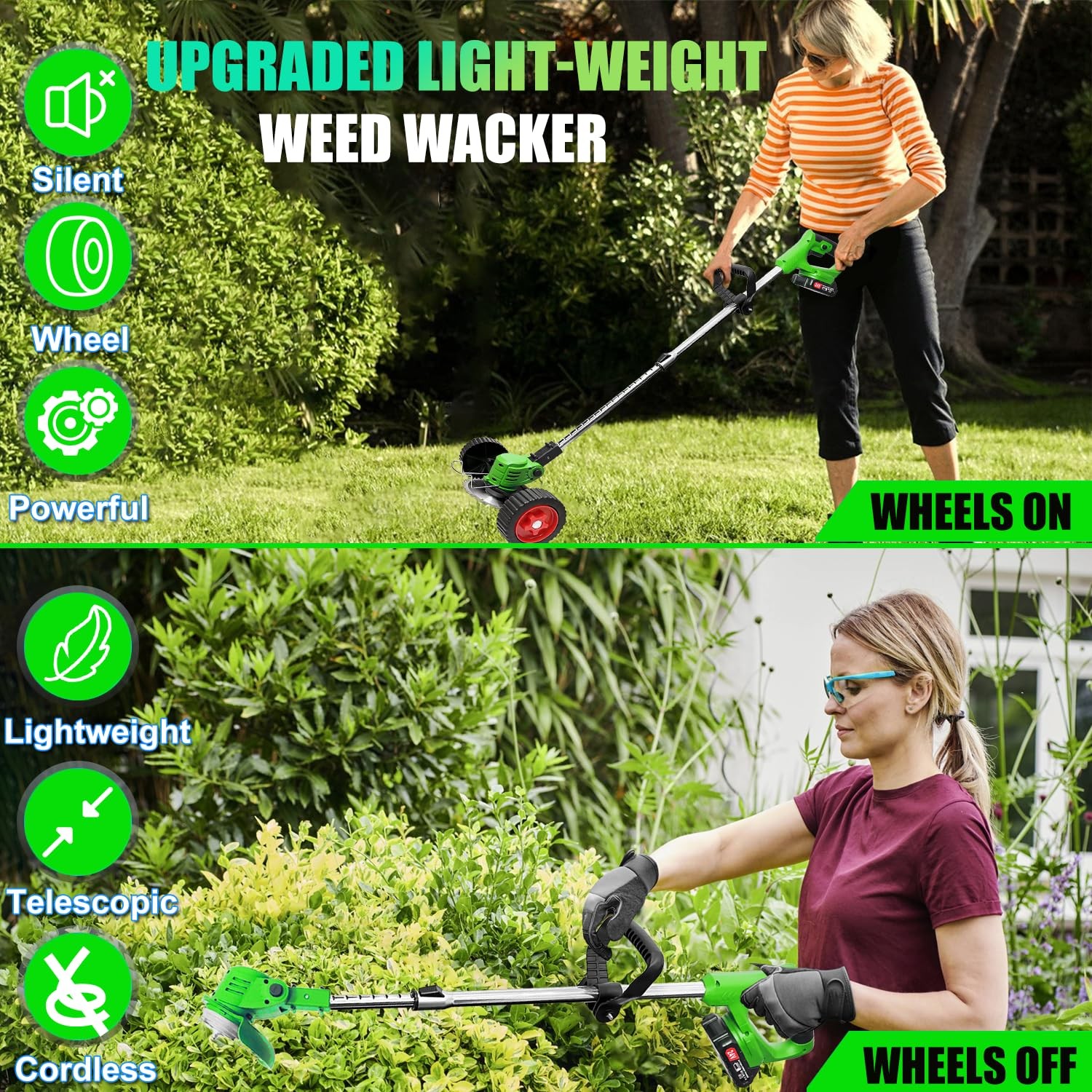 【5 Types of Cutting Blades】 2025 Plastic blade suitable for mowing soft grass; Rhombus blade suitable for weeds or small shrubs; S-blade suitable for plants and reeds; Saw blade suitable for pruning branches; weed whacker string for trimming tall and thick grass Different blades meet different weeding needs, Ideal for trimming around yards and bushes, lots, flower beds, walkways, patios 【MULTI-FUNCTION GRASS TRIMMER】2025 New grass trimmer/ lawn edger/ small mower/ brush cutter cordless weed wacker with 850W high-power motor, the speed can reach 20,000RPM, the battery operated weed wacker is an efficient and reliable helper to keep the lawn, driveway and flower bed clean, and can trim dense grass for your lawn or garden. You can enjoy patio mowing time! 【3-IN-1 Electric Weed Wacker】Plastic blade suitable for mowing soft grass; Rhombus blade suitable for weeds or small shrubs; Saw blade suitable for pruning branches; Ideal for trimming around yards and bushes, lots, flower beds, walkways, patios. More professional tools can make your gardening work easier and more enjoyable 【ADJUSTABLE HEIGHT & ROTATING HEAD】Cordless weed wacker battery operated the handle adopts ergonomic design Adjustable length of telescopic shaft which total length is about 35-47 inches, the angle of the String Trimmer Cordless head can be adjusted (0-90°) at will to fit for most complex working environments. Weed wacker battery powered women and the elderly can easily use, allowing you to easily care for any hard-to-reach nooks and crannies 【PRODUCT INCLUDES】1 x Cordless weed trimmer; 2 x Batteries ; 1 x Circular Saw Blade; 4 x Metal blades; 10 x Nylon Blades; 1 x User Manual; 1 x Fast Charger; 1 x Work Gloves; 1 x Goggles; 1 x Cleaning brush. making it a must-have for anyone looking to tackle gardening tasks with ease 【EXCELLENT AFTER-SALES SERVICE】Our 24/7 friendly customer support ensures you're worry-free post-purchase. We'll do everything we can for your any issue. reach out anytime. Our experts respond within 12 hours, dedicated to resolving your concerns for a confident purchase experience. Enjoy peace of mind with our 90-day replacement policy for battery-operated electric weed whackers.