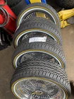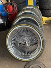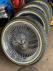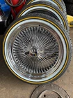 Upgrade your vehicle with these stylish and high-performing 22" wire wheels from LA Wire. Designed with a gold white sidewall and chrome plated finish, these wheels are perfect for any passenger car, van, or SUV. The one-piece cast construction ensures durability and strength, while the 150 spoke design provides a classic look. These wheels are compatible with Vogue Tires and come in a package quantity of 4. The 265 section width and 35 aspect ratio make them suitable for all seasons, while the 14/32" tread depth ensures a comfortable ride. The wheels have a bolt pattern of 5X127+ 5X120.65 +5X114.3 and an offset of standard. The DOT date code is 2023, and the tire model is Custom Built Radial. Get your hands on these amazing wheels today! Shipped via UPS Ground