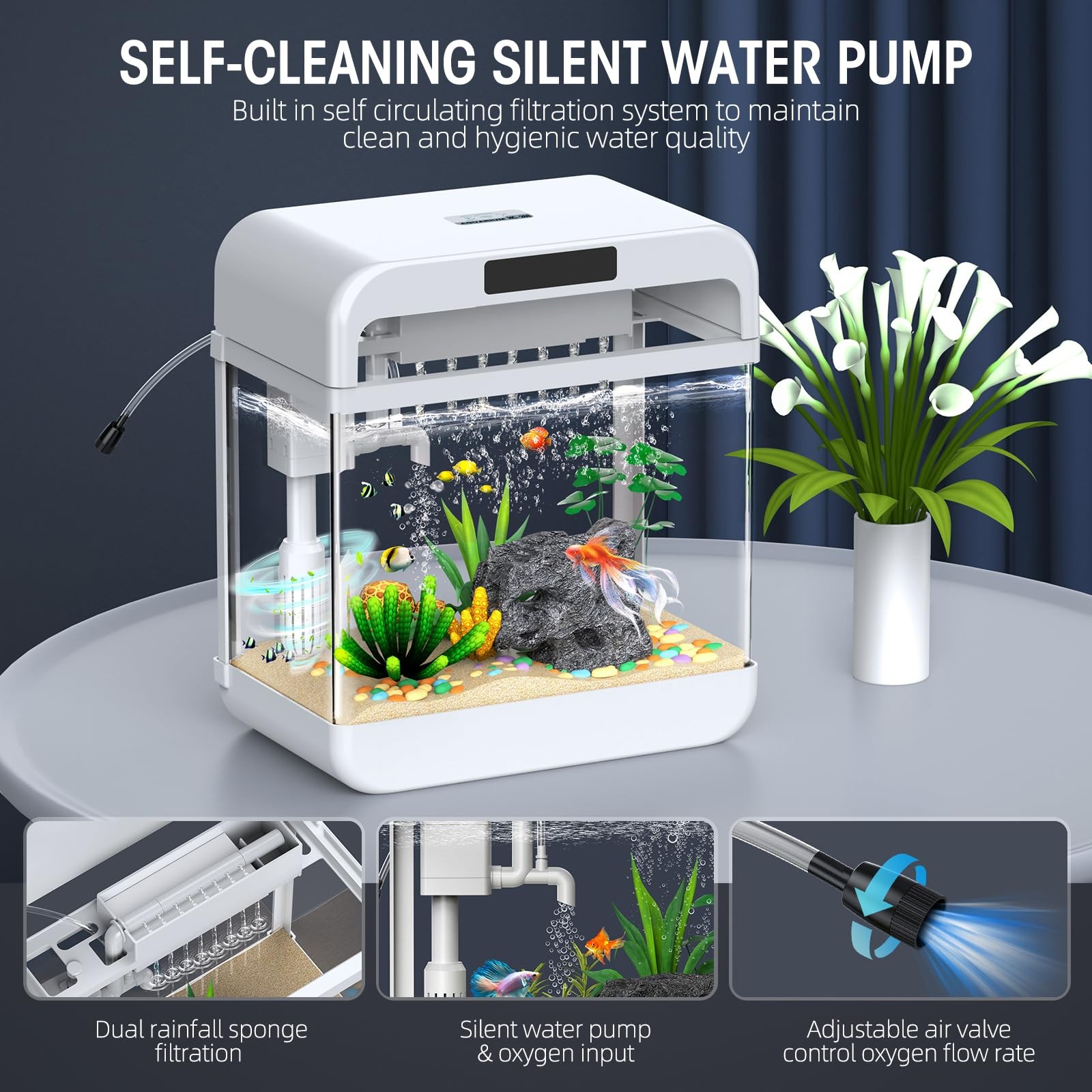 Fish Tank 2.2 Gallon Fish Bowl with Adjustable 3 Color Lighting 3 in 1 Quiet Pump with Filteration, Oxygenation, Water Circulation Triple Function, HD Float Glass, Leak-Proof Thickened Base 【3 Colors Adjustable Lighting System】Featuring waterproof 8 light beads on the cover's top, it offers three light color options: white, blue, and red (the red color is not that obvious). Easily adjust the colors with the on/off button, but here's the hidden gem: a gentle press toggles the colors while a firm press switches the system on or off. So please remember to use a light touch that is just press the button one-third of the way down.when adjusting colors of the light. 【Triple Self-circulating Filteration System】Self-cleaning Fish tank with a 3-in-1 silent water pump which combines filtering, oxygenation, and water circulation, it also features a reusable filter sponge for 4-pronged filtration, ensuring crystal-clear water and a stable environment for your fish. Designed with an extended rain pipe for a soothing ambiance and visual waterfall experience. 【Enhanced Durability and Clarity】Well-built fish tank crafted from automotive-grade float glass with more than 3mm thickness, experience a 360° HD viewing immersion while the heightened protective features and thickened anti-slip base ensure enduring durability and minimizing maintenance costs. 【Effortless Assembly & Maintenance】Enjoy aquarium ownership with our intuitive design and clear instructions. Easily adjust lighting modes and humidifier spray modes, while water changes are a breeze. Each aspect is designed for effortless operation, ensuring a seamless experience for all 【What You Get】This fish tank kit includes three decorative plants (random type), a removable blue board to prevent fish from jumping out, A resuable filter sponge, 3-in-1 water pump,Clear user instructions and providing a complete entry-level set-up perfect for keeping bettas, guppies, and other saltwater or freshwater fish