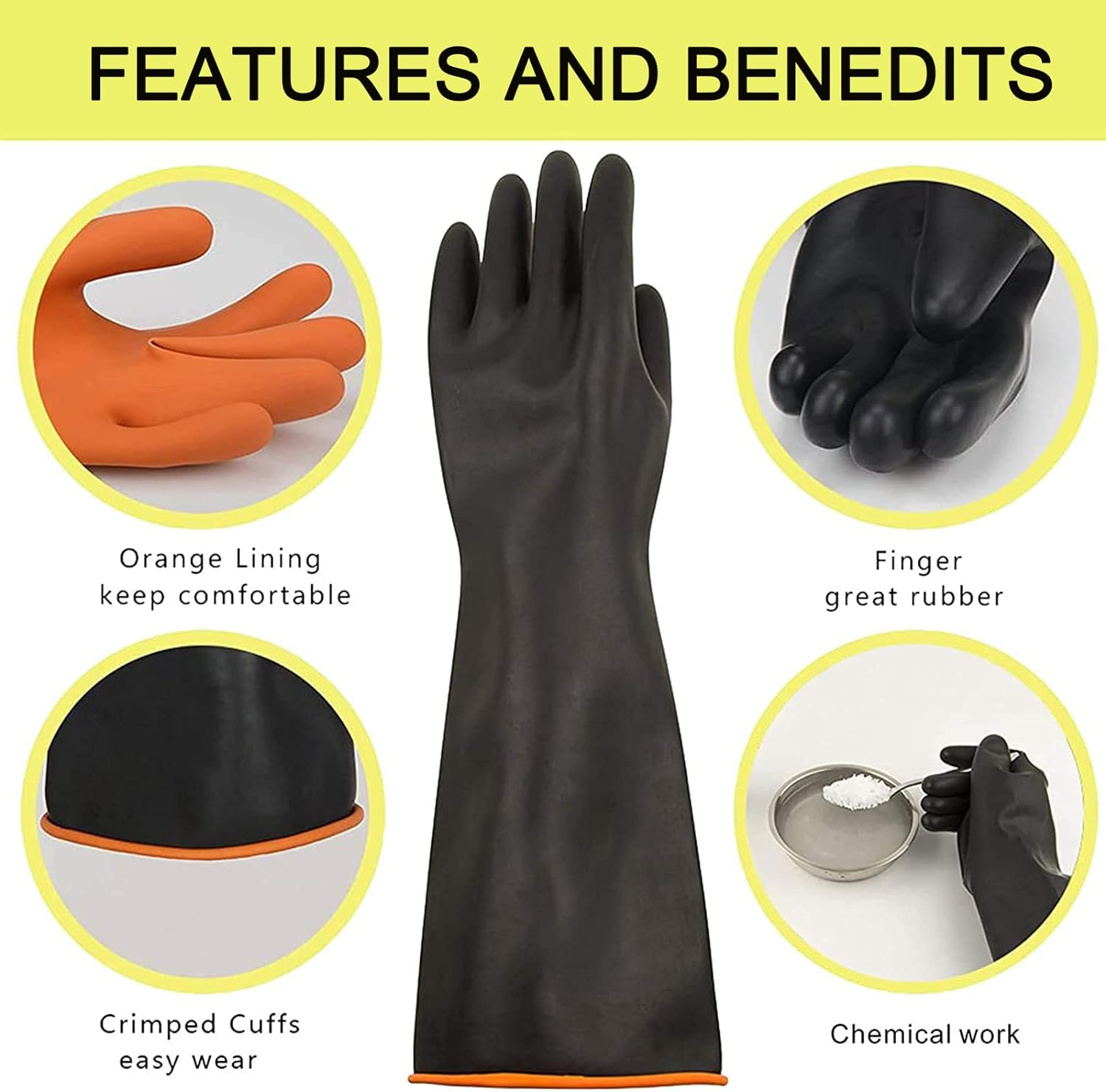 Store New Arrivals Add to Favorite View Feedback Contact 22" Latex Chemical Resistant Gloves, Reusable Heavy Duty Long Rubber Gloves Dishwashing Gloves, Industrial Safety Gloves for Men, Forearm Protection Waterproof Resist Strong Acid, Alkali, Oil, XL Size Description Department Unisex Adult Product Dimensions 1.97 x 1.97 x 0.39 inches; 10.58 ounces Country of Origin China Product Description 22" Reusable Heavy Duty Long Latex Chemical Resistant Safety Gloves High quality natural latex has excellent chemical resistance and tear resistance. Smooth inner layer for easy wearing and keeping your hand comfortable. Characteristic: resistance to acids and alkalis, resistant to wear, long durability, strong tenacity, tear resistant. The ideal thickness offers fantastic safe protection while remaining sensitive to touch. Premium Latex Gloves - A Good Helper in the Chemical Industry Multipurpose latex gloves, suitable for machine repair, garden work, chemical treatment, laboratory and daily household cleaning. ABOUT US We offer the best prices around on high quality products. Our E-store includes media such as books, movies, music and games while offering electronics, toys, sporting apparel, clothing, tools, general home, garden items and more. SHIPPING We are always working hard to ensure your package arrives as soon as possible. Please understand that some factors like weather, high postal traffic, and the performance of shipping companies are outside of our control. We offer free shipping to the lower 48 states and ship within 2 business days of payment, usually sooner. We do not accept P.O. Boxes. Please provide a physical address. RETURNS We offer a 30-Day Return Policy on items which you are not completely satisfied with. You have the option for a full-refund or an exchange of the item. No returns are available on items shipped outside of the USA. PAYMENT We accept PayPal. CONTACT US This page content is yet to come Please ad us to your favorite seller and visit again later Thank You CUSTOMER SATISFACTION We try our very best to make sure every customer is completely satisfied. If there's a problem, message us! We're happy to help.