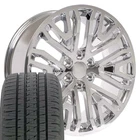 22" Wheels & Bridgestone Tires Fit Silverado Custom wheels Chrome B1W Description: Fits: GMC Wheel and Tire Set - CV37 Sierra Truck Rims and Tires Wheel Size: 22x9 Bolt Pattern: 6-139.7 Offset : 28.0 Tire Size: 285-45-22 Fits: Fits: Cadillac Escalade 1999-2024, Chevrolet Avalanche 1500 2002-2013, Chevrolet Blazer 1992-1994, Chevrolet C-2500 2WD 1988-2000, Chevrolet Colorado 2024, Chevrolet Express 1500 2003-2014, Chevrolet K-1500 4WD 1988-1998, Chevrolet K-2500 4WD 6 Lug 1988-2000, Chevrolet Silverado 1500 1999-2024, Chevrolet Suburban 1500 1988-2024, Chevrolet Tahoe 1995-2024, GMC C-2500 2WD 6 Lug 1988-2000, GMC Canyon 2024, GMC K-1500 4WD 1988-1998, GMC K-2500 4WD 6 Lug 1988-2000, GMC Savana 1500 2003-2014, GMC Sierra 1500 1999-2024, GMC Yukon 1500 1992-2024, Infiniti QX56 2004-2013, Infiniti QX80 2014-2024, Nissan Armada 2004-2024, Nissan Titan 2004-2024, RAM 1500 6 Lug 2018-2024. Fitment guaranteed for stock equipped vehicles only. WILL NOT FIT: Suburban C1500 1988-1999, Tahoe 2WD 1995-1999, Yukon 2WD 1992-1999, Escalade Hybrid. Fitment is not guaranteed for vehicles equipped with upgraded or modified brakes, suspension or drive train. Finish Detail: Chrome Wheel: Chrome is a brilliant and durable finish that, with a little care, can stand the test of time. A classic chrome finish is accomplished in a three step plating process. The first layer of plating is copper which adheres to the wheel and creates a smooth foundation. The second is nickel, providing hardness and durability. The final layer is chrome, which creates a bright cosmetic finish. Center caps: Center cap included, Original center cap will interchange Shipping: FREE Standard Ground Shipping! INTERNATIONAL BUYERS PLEASE NOTE: Additional shipping is required for international, US Protectorates, HI and AK shipments. Import duties, taxes, and charges levied by other countries are not included in the item price or shipping cost. These charges are the buyer's responsibility. If you have questions or are not sure about these fees, please check with your country's customs office to determine what these additional costs will be prior to bidding or buying. Disclaimer: To the best of our knowledge, all photos and fitment information contained herein are accurate. However, OE Wheels assumes no liability related to product use and fitment. Buyers are solely responsible to insure that product use and fitment is consistent with their year/make/model. If you would like a different wheel or tire size please message or call us for a quote. DISCLAIMER: We are not affiliated with any manufacturer referenced in this listing in any way or form. Trademarked and registered terms are used for fitment and descriptive purposes only. All other trademarks or registered trademarks are the property of their respective owners. We affirm that our use of any trademarked terms in product descriptions constitute fair and nominative use and is in no way to offer confusion that our listings or any mentioned manufacturer's products or their companies are related.