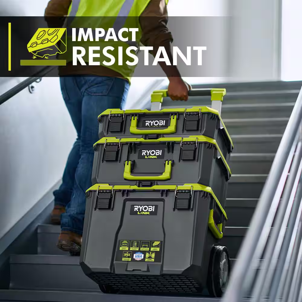 Fast Shipping On All Items 30 Days Money Guarantee Customer Support Excellent Service 100% Satisfaction Satisfaction Guaranteed 22.2 In. LINK Rolling Tool Box with LINK Medium Tool Box Specification Color Family Green Color/Finish Green Features Handles,Lockable,Pre-Assembled,Wheeled Holding Capacity (cu in) 3465 cu in Included Accessories Latches,Push Handle,Wheels Material Plastic Modular Storage Type Rolling Tool Box Modular System Type LINK Product Weight (lb) 10 lb Returnable 90-Day Tool Box Type Modular Tool Box Tool Storage Product Type Modular System Tools Product Type Tool Storage Weight Capacity (lb) 200 Maximum Handle Length (in) 43.5 in Product Depth (in) 20.6 in Product Height (in) 29.3 in Product Width (in) 22.2 in 22.2 inches x 20.6 inches x 29.3 inches. Weight: 10.0 lb Item Description LINK Rolling Tool Box Features Telescoping Handle & 9 in. Wheels Includes: LINK Medium Tool Box Compatible with RYOBI LINK Modular Storage System The RYOBI LINK Modular Storage System is revolutionizing the storage industry, enabling you to Organize, Access and Transport your life. The RYOBI LINK Rolling Tool Box is designed with impact resistant material to handle the toughest of situations. It has a wide, steel telescoping handle and 9 in. all terrain wheels that support a 200 lb. load capacity. This Rolling Tool Box is IP65 rated to protect your items from water and dust in any environment. The integrated RYOBI accessory bit storage and included Double Organizer Bin provides maximum organization. Easily secure your items with a locking point and integrated tie down anchors. The RYOBI LINK Medium Tool Box is designed to handle the toughest of situations with impact resistant material and an 80 lb. load capacity. This Medium Tool Box is IP65 rated to protect your items from water and dust in any environment. Best of all, it is part of the RYOBI LINK Modular Storage System line of products that use the same locking technology to seamlessly connect your mobile and stationary storage needs. Own your space with RYOBI LINK Modular Storage System. About us We offer the best prices around on high quality products. Our E-store includes media such as books, movies, music and games while offering electronics, toys, sporting apparel, clothing, tools, general home, garden items and more. Shipping We are always working hard to ensure your package arrives as soon as possible. Please understand that some factors like weather, high postal traffic, and the performance of shipping companies are outside of our control. We offer free shipping to the lower 48 states and ship within 2-3 business days of payment, usually sooner. We do not accept P.O. Boxes. Please provide a physical address. For shipping outside of the continental USA, we only use eBay's Global Shipping Program.The item is shipped to KY and then sent to the rest of the world. International customers are responsible for all duties and taxes. Continue to check out to calculate costs for shipping the item to your country. Messages regarding eBay's Global Shipping Program MUST be directed at eBay EXCLUSIVELY. Returns We offer a 30-Day Return Policy on items in which you are not completely satisfied with. You have the option of a full-refund or an exchange of the item. No returns are available on items shipped outside of the USA Satisfaction We try over very best to make sure every customer is completely satisfied. If there's a problem, message us! We're happy to help. Payment Options Shop With Confidence