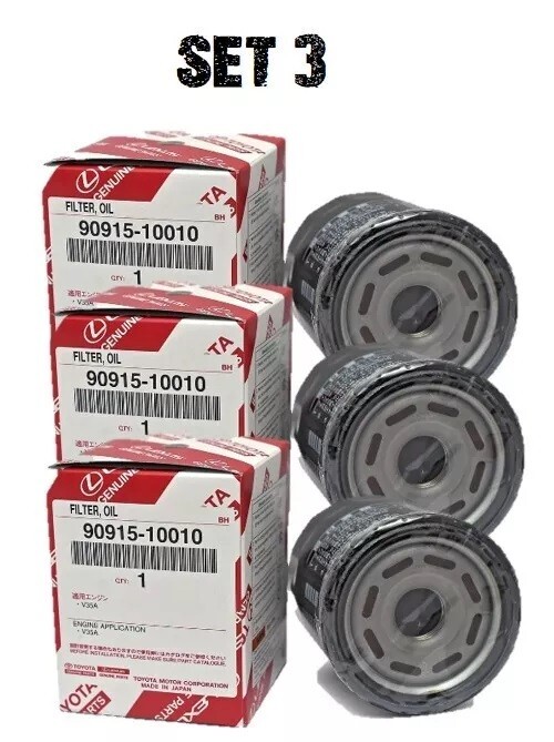 The product is a set of three genuine OEM oil filters made by Toyota specifically for the 22-24 Toyota Tundra 3.5TT V35A Sequoia. These bolt-on filters are made of metal with a rubber gasket for easy installation. Manufactured in Japan, they come with a 1-month manufacturer warranty and are designed for easy installation. The filters have a matte finish and are interchangeable with the OE/OEM part number 90915-10010. Ideal for those looking for high-quality oil filters that are reliable and compatible with their Toyota vehicle.