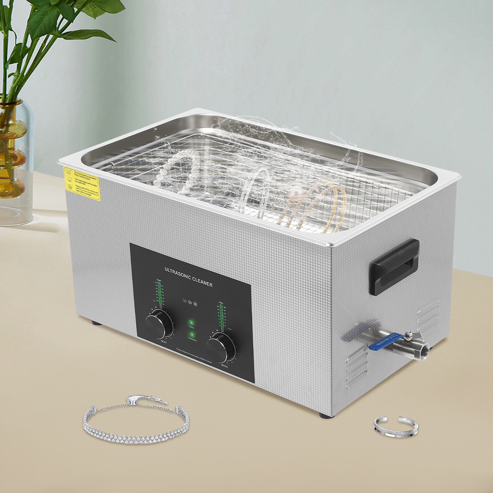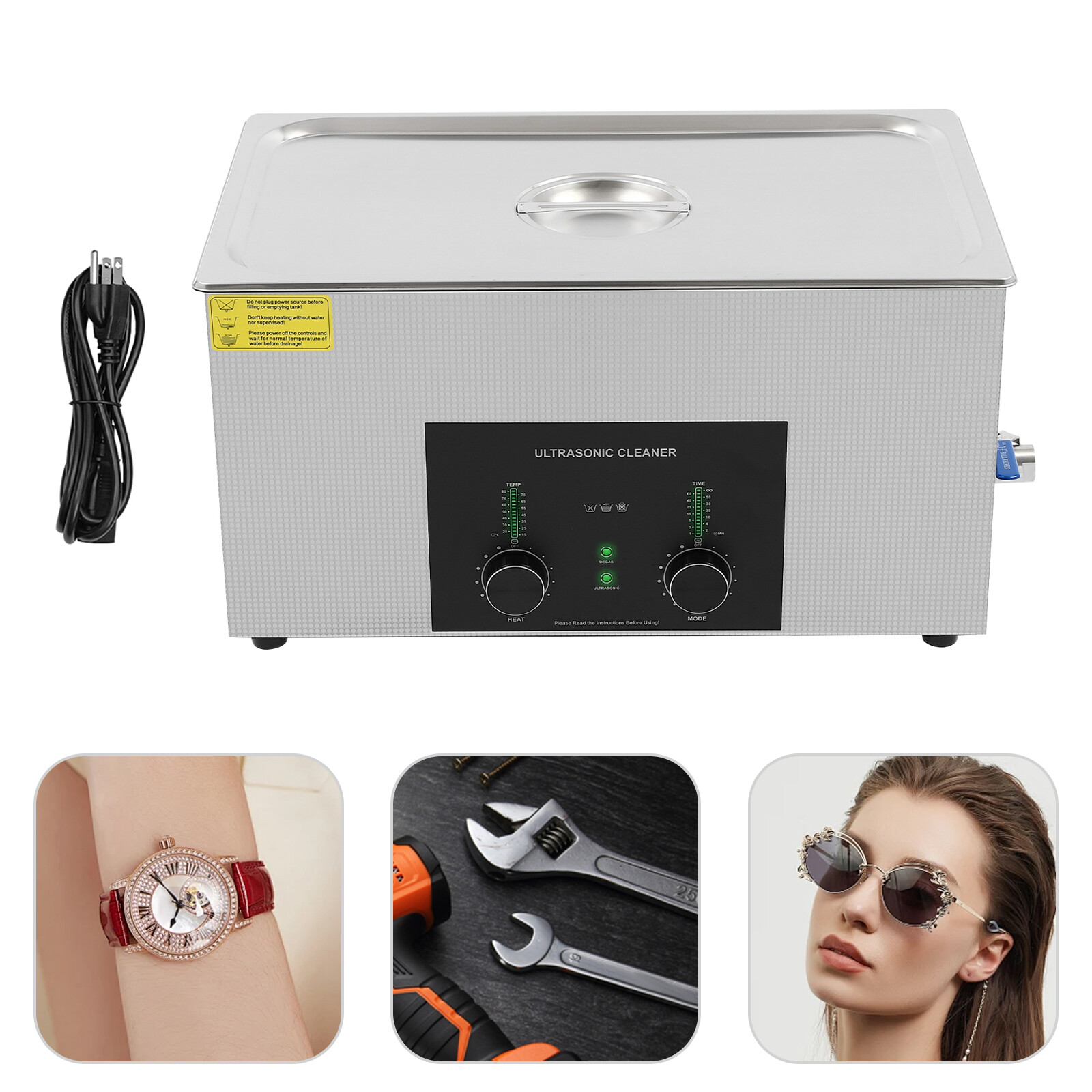 Specifications Color: Silver Style: Modern Shape: Rectangular Material: 304 Stainless Steel, 201 Stainless Steel Mount Type: Countertop Assembly Required: Yes Plug Type: US Standard Power Supply: AC100-120V, 60Hz Ultrasonic Frequency: 40Khz Ultrasonic Power: 480W Heating Power: 500W Power Cord Length: 1.5m/4.92ft Temperature Range: 15-80℃/59-176℉ Time Setting Range: 1-60min Inner Capacity: 22L/5.81Gal Effective Capacity: 17.5L/4.62Gal Drain Valve Diameter: 1/2" Product Inner Size: 50*30*15cm/19.69*11.81*5.9in Cleaning Basket Size: 46.5*26.5*8.7cm/18.3*10.43*3.43in Packaging Size: 66*42*35.5cm/25.98*16.54*13.98in Gross Weight: 12.47kg/27.49lbs Net Weight: 10.4kg/22.93lbs Package Included 1* Ultrasonic Cleaning Machine 1* Cleaning Basket 1* Power Cord 1* English Specifications Color: Silver Style: Modern Shape: Rectangular Material: 304 Stainless Steel, 201 Stainless Steel Mount Type: Countertop Assembly Required: Yes Plug Type: US Standard Power Supply: AC100-120V, 60Hz Ultrasonic Frequency: 40Khz Ultrasonic Power: 480W Heating Power: 500W Power Cord Length: 1.5m/4.92ft Temperature Range: 15-80℃/59-176℉ Time Setting Range: 1-60min Inner Capacity: 22L/5.81Gal Effective Capacity: 17.5L/4.62Gal Drain Valve Diameter: 1/2" Product Inner Size: 50*30*15cm/19.69*11.81*5.9in Cleaning Basket Size: 46.5*26.5*8.7cm/18.3*10.43*3.43in Packaging Size: 66*42*35.5cm/25.98*16.54*13.98in Gross Weight: 12.47kg/27.49lbs Net Weight: 10.4kg/22.93lbs Package Included 1* Ultrasonic Cleaning Machine 1* Cleaning Basket 1* Power Cord 1* English Manual Description This ultrasonic cleaner's high-frequency ultrasonic waves can delve into microscopic crevices, breaking down grease and stains adhering to jewelry, spectacles, tableware, braces, and other miniature, intricate items. It features a knob-type timer and temperature control design for a simple operation that simplifies cleaning tasks, bringing technological convenience to your daily life. Key Features Quality and Reliability : The product is made of 304 stainless steel and 201 stainless steel, which is resistant to rust, corrosion, and deformation, giving the product a long service life and excellent working performance. Efficient Cleaning: Different from other cleaning technologies, 40Khz ultrasonic technology can remove dirt on the surface of objects, and penetrate blind holes, and cracks, thus thoroughly cleaning the dirt that cannot be cleaned by hand without damaging your belongings. Moreover, the degas mode can eliminate ultrasonic fatigue and improve cleaning results. Adjustable Design: The product comes with knob-type temperature (59-176℉) and time control (1-60min) to meet the cleaning needs of different objects. Large Capacity: The 4.62gal effective capacity and large cleaning basket (18.3*10.43*3.43 inches) can easily hold and clean most of your watches, jewelry, and more. Efficient Heat Dissipation: The heat dissipation windows and the powerful cooling fan can accelerate heat dissipation, reduce failure rate, and increase service life. Safety Guarantee: The product is equipped with a fuse, when the circuit is overloaded, it will automatically fuse to stop the power supply, avoiding damage to the machine and injury to you. Simple Operation: Equipped with an intuitive and user-friendly operational interface, this product simplifies activation and adjustment of cleaning time and temperature settings, making it accessible to you. Easy to Clean: The fingerprint-resistant stainless steel shell, simple structure, and smooth surface make it more convenient for daily cleaning. Details Cleaning Basket: It can reduce scratches during cleaning to better protect your valuables items, and can also be used to drip-dry items. Side Handles: They make it convenient to move the machine. Drain Valve: It allows you to drain standing water and cleaning fluids more easily. Top Lid: It can well seal the machine to reduce heat loss and noise. Meanwhile, the handle on the top allows you to easily pick up the lid. Sturdy Feet: They prevent the product from sliding and enhance stability during operation. Application It can be used in homes, laboratories, the jewelry industry, industry, electrical industry, hospitals, and more. It is specially used for cleaning jewelry, eyeglasses, watches, dentures, dental instruments, clocks and watches, motorcycle parts, automobile parts, bicycle parts, hardware, tools, engine parts, and more. Notes Please check the size carefully before ordering. Please note that the heating is turned on when the preset temperature is higher than the actual temperature. Please note that the ultrasonic cleaning process can also slowly heat the cleaning liquid, so the temperature of the cleaning liquid is likely to be higher than the preset temperature. 304 stainless steel material makes the device resistant to weak acids and weak alkalis. However, please don't use strong acids or strong alkali. Please do not place items directly on the bottom of the cleaning tank and please put items into the washing basket for cleaning. It needs to be filled with 2/3 of the water and please avoid dry-burning. Please read the operating manual and label completely before use. And pay particular attention to the safety instructions included. Please allow the slight color difference caused by the shooting light and 1-3cm error due to manual measurement, and make sure you do not mind before you order. Payment Delivery details Terms of sales About us Contact us Payment We accept ebay payment 。 Fees such as import duties, taxes are not included in the item price or shipping costs. These charges are the buyer's responsibility. Delivery details Shipping: 2-9 working days to: USA Terms of sales We maintain high standards of excellence and strive for hundred percent customer satisfaction. Feedback is very important to us. We hope that you contact us immediately before you give neutral or negative feedback, so that we can address your concerns. It is impossible to address i