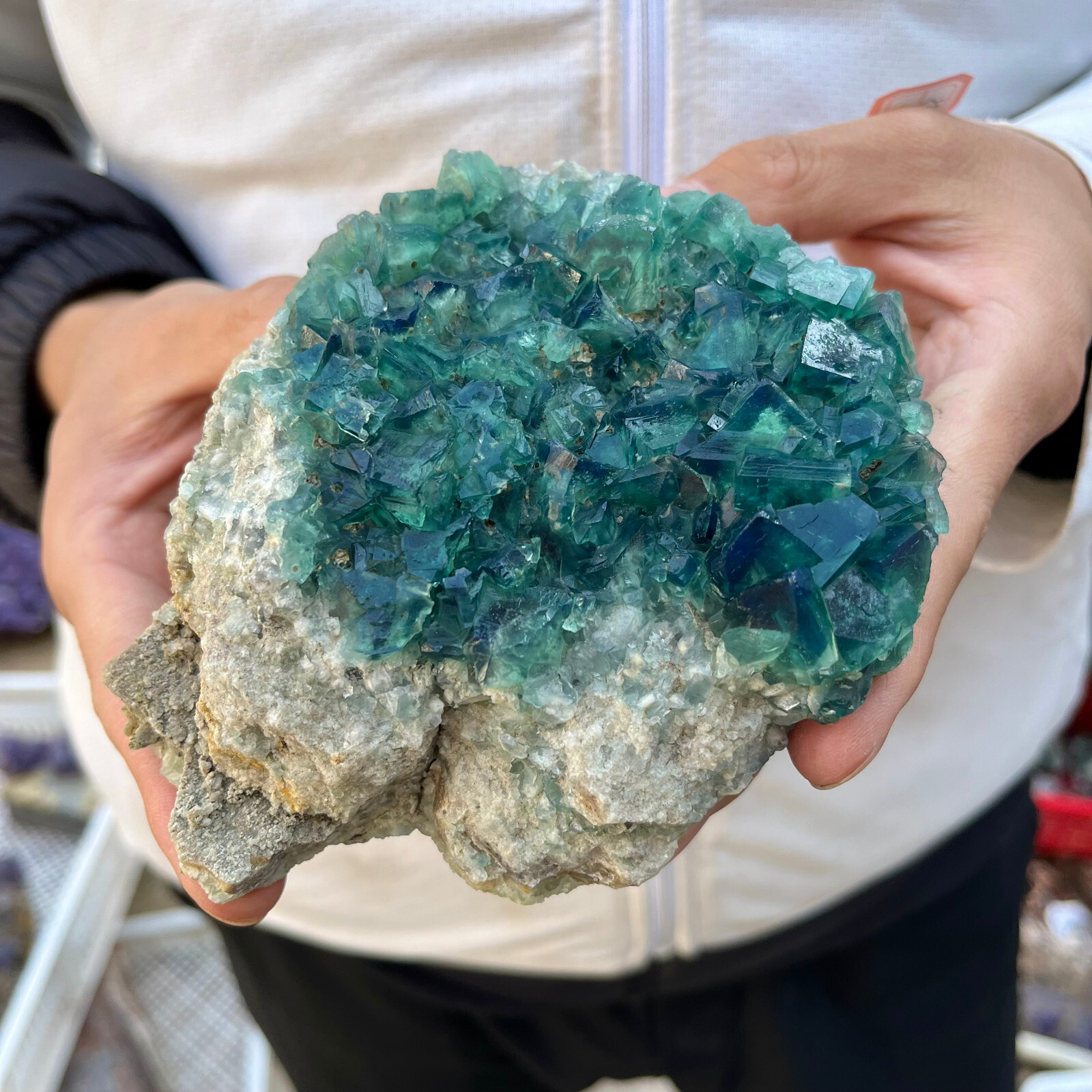 Amazing blue green hues in the fluorite. Item got here super quickly and it was wrapped completely in bubble wrap and tape. It looks exactly like the picture. It’s a solid chonk of a rock with interesting white flecks of crystal on the bottom. A+ transaction!!!