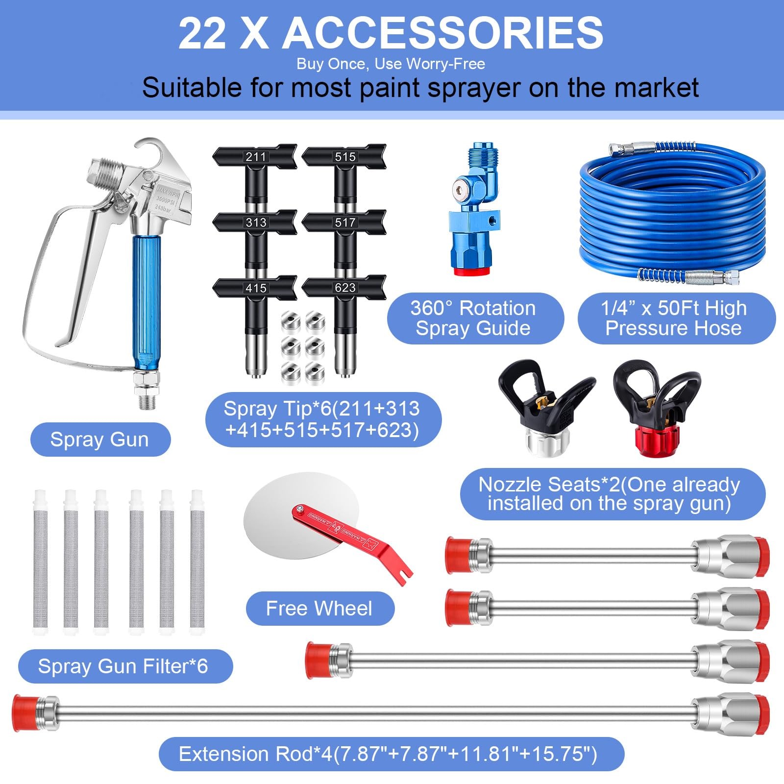 Specifications: Spray Tips Model: 211/313/415/515/517/623 Color: Black Silver Blue Material: Aluminum Alloy/Stainless Steel/Tungsten Steel Features: 1.The spray tips are very easy to install, it can be quickly installed in a short time without tools. 2.The spray gun filter can effectively help you filter impurities in the paint and prevent the nozzle from clogging. 3.The airless paint sprayer tips adopts a reversible design. Just rotate the nozzle and pull the trigger to quickly clean and clear the blockage. 4.The main body of the sprayer tip is made of tungsten steel, which is sturdy and durable. It will not be easily damaged even after long-term use. Package Includes: 1 pcs spray gun 1 pcs 50ft high pressure hose 1 pcs free wheel 1 pcs 180 degree rotation spray guide 2 pcs nozzle seat 4 pcs extension rod 6 pcs spray tips 6 pcs spray gun filters Package Includes: You will receive 1 pcs airless spray gun, 1 pcs 50ft high pressure hose, 6 pcs spray tips(211 313 415 515 517 623), 4 pcs extension rod(7.87"+7.87"+11.81"+15.75"), 2 pcs nozzle seat, 6 pcs spray gun filter, 1 pcs free wheel and 1 pcs 180 degree rotation spray guide. With just one purchase you have all the accessories you need to paint and start enjoying your painting time! Wide Compatible: The airless paint sprayer gun kit can be adapted to most airless paint sprayer, 50ft hose can accommodate a variety of work areas. Six modle of nozzles and four sizes of extension rods can meet your various spraying needs. The nozzle seat and spray gun filter can help you prevent paint splashes or drips, filter impurities in the paint and avoid nozzle clogging. The spray guide accessories tool can help you rapid spraying edges and trimming. Easy Installation: The airless paint sprayer gun are very easy to install. You only need to install the tip seal on the nozzle, then insert the spray tip into the nozzle and slightly rotate it to complete the installation. Then connect the spray gun and paint sprayer with a high pressure pipe to start your spraying work.(You can learn detailed installation steps, replacement steps for the spray gun filter element, and how to install the spray guide accessory tool through pictures.) Material: The spray gun and other accessories are made of aluminum alloy and stainless steel, high pressure hose is made of polymer fibers, the spray tip is made of tungsten steel, which is strong and durable. It feels comfortable and will not be easily damaged even after long-term use. At the same time, the spray tip adopt a reversible design, you just need to rotate the spray tip 180° and pull the trigger, it will be quickly complete the cleaning and dredge the blockage. Wide Application: The airless paint sprayer gun accessories are ideal for spraying doors, trim, interior walls, ceilings, fences, cabinets, sheds, decks and many other places indoors and outdoors, which can meet your needs for various spraying projects.