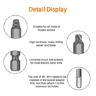 Look , You may also like 12Pcs HSS Hex Shank Drill Bits Tap M3-M10 Metric SAE Screw Thread Drill Bits Set 16.07 USD Free shipping 20Pcs Screwdriver Bits Titanium Coated 1/4" Hex Shank Phillip Head PH2 Anti Slip 10.01 USD 4.59 USD Magnetic 1/4"Hex Shank Drill Bits Set Anti Slip Cross Head Impact Screwdriver 9.96 USD Free shipping 6/12PCS Damaged Screw Extractor Se Extractor Speed Drill Bit Broken Bolt Remover 8.6 USD 1.59 USD 22PC Drill Bait Damaged Screw Extractor Steel Screw Socket Set Bolt Removal 14.22 USD Free shipping Black Tile Drill Bit Set YG8X Cemented Carbide Tip 3/4/5/6/7mm 1/4" Hex Shank 9.67 USD 2.99 USD 10/20Pcs 1/4'' Hex Shank Magnetic PH2 Screwdriver Drill Bit Anti-slip Hand Tool 8.89 USD Free shipping 5Pcs 3/4/5/6/7mm Drilling Bit 1/4" Hex Shank Carbide Tile Metal Drill Bit Set 9.8 USD 2.99 USD 6pcs Damaged Screw Extractor, Stripped Screw Broken Drill Remover Tool Kit US 8.4 USD 1.59 USD Set of 12pcs Damaged Screw Extractor Broken Screws Bolt Stripped Remover Tool 12.39 USD Free shipping 6/12pcs Damaged Screw Extractor Speed Out Drill Bit Tool Set Broken Bolt Remover 7.87 USD 1.59 USD 10/20pcs Magnetic Drill Bits 1/4" Hex Shank PH2 Cross Head Impact Screwdriver 8.2 USD 0.99 USD 22Pcs Damaged Stripped Screw Extractor Set for Broken Screw Magnetic Drill Bit 22 PC Damaged Stripped Screw Extractor Set for Broken Screw, All-Purpose HSS Broken Bolt Extractor Screw Remover Set with Magnetic Extension Bit Holder & Socket Adapter Features: 1. Screw extractor is made of high quality High-Speed Steel 4241. High hardness, durable and easily remove damaged screws 2. The stripped screw extractor set is included two extension bit holder. Can remove in one step, do not need to conversion the extractor or adjust the chuck 3. The stripped screw extractor kit is includes 20 pieces of stripped screw extractor in 10 different sizes to satisfy all you demand. Suitable for any sizes screw or bol 4. Suitable for allen bolts, machine screws, lag bolts, wood screws, hex bolts, sheet metal screws and other screws 5. It is best to use electric hand drill, can not be used the hammer drill mode! Must be low speed during use! Specifications: High-Speed Steel 4241 Suitable for general sizes and all kinds of broken bits Universal chuck that suitable for most electric hand drills Remove broken screw in one step How to Use the Screw Extractor? 1. The size of #6 - #10 needs to be installed in the socket adapter first, and then attach it to the extension bit holder (The other sizes can be attached to the extension bit holder directly) 2. Use the drill(Dr) bit to drill a hole in broken screws 3. Change to use the extract(Ex) bit with the same size 4. Reverse use the drill and take out the broken bit Warm Tips : 1. Must drill a hole first when the break screw surface is smooth. Otherwise the drill bit will slip 2. Must be vertical and low speed when drilling, reverse use this bit, drill the first hole deeper will easier to take out 3. It is best to use electric hand drill, can not be used the hammer drill mode! Must be low speed during use! Package Included: 20* damaged screw extractor 1*Magnetic Extension Bit Holder 1*Socket Adapter Note: 1. Please allow a bit error due to manual measurement. please make sure you do not mind before you bid. 2. The color may have different as the difference display, pls understand.