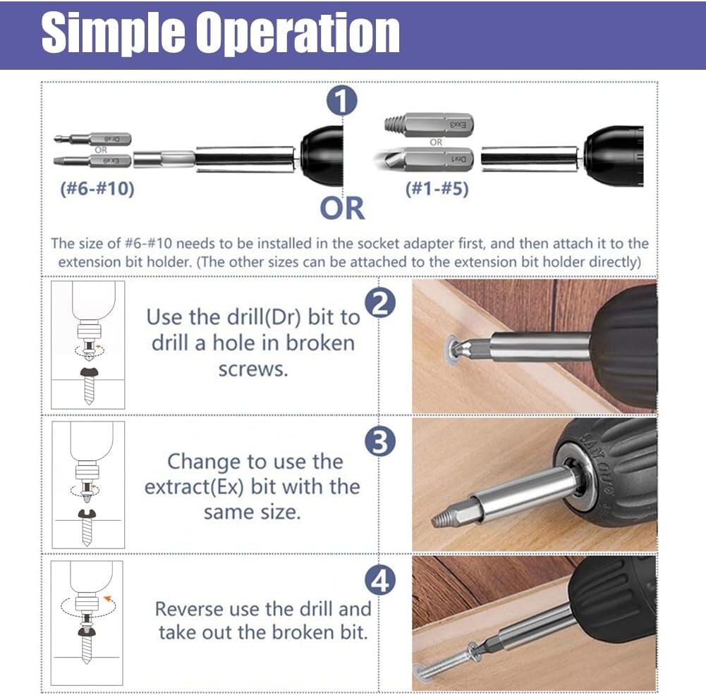 Yakamoz 22Pcs Mini Damaged Screw Extractor Kit Small Stripped Screws Remover Easy Out Broken Bolt Extractor Rusty Screw Removal Tool with Magnetic Extension Bit Holder & Socket Adapter Description Multiple Sizes - Includes 22pcs and composed of 10 different sizes of drills and extractors which makes it compatible with all kinds of drills and remove any type of screws and bolts. Effortless Screw Extraction: - Stripped screw extractor with spiral design enhances grip and minimizes slipping can remove damaged, stripped, or rusted screws and bolts effortlessly. Easy to Use - Choose a drill bit smaller than the damaged screw to drill a hole first. Then attach the extractor to your drill, apply moderate pressure, and watch as the damaged screw loosens and comes out. High Quality - These damaged screw extractor made of High-Speed Steel 4241 for maximum strength and high hardness, remove the broken or rusting screws easily. Must-Have Tool - Ideal for handyman, woodworker or fitment worker, provides an extractor bit to remove all common sizes of damaged, stripped or broken screws.