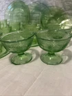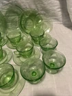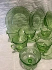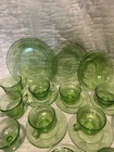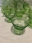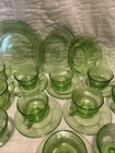This beautiful set of 23 Federal Georgian Love Birds green depression glassware is a must-have for any antique collector or lover of vintage dinnerware. The set includes a variety of pieces such as dinner plates, tea cups, and even a uranium plate, all featuring the iconic Love Birds pattern. Crafted by the renowned Federal Glass brand, this kitchen set is a true representation of the Georgian style and production style. The glossy finish and high-quality material make this set a durable and timeless addition to any kitchen or dining room. Add this unique and original piece to your collection today! ***set of 23 pieces