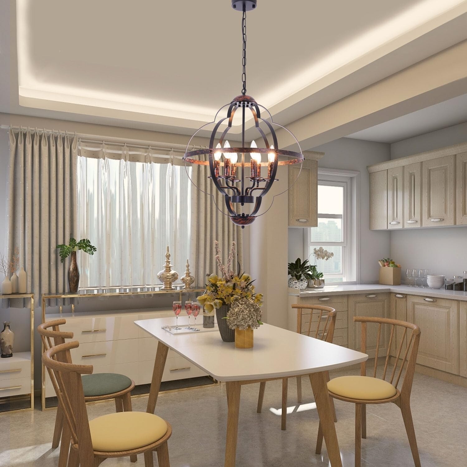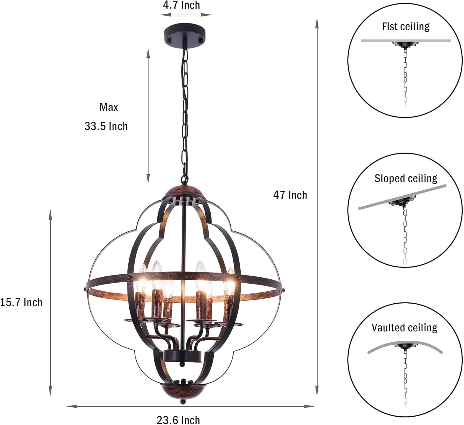 23.6" 6-Lights Rustic Chandelier Adjustable Hanging Light Retro Ceiling Fixtures About this item 【Farmhouse Chandelier】This rustic and artistic chandelier features a black and rust metal frame and elegantly simple lamp arms. Its robust design and geometry frames create a timeless aesthetic, making it perfect for any space such as the kitchen island, bedroom, foyer, dining table, living room, entryway, farmhouse, and office 【Height Adjustable Chandelier】This rustic farmhouse chandelier can be adjusted Max 47" in height to meet any lighting need, providing stability and reducing shaking. This dining room chandelier is suitable for both sloped and flat ceilings, adapting to diverse room layouts 【E12 Bulb Requirement】Farmhouse hanging chandelier equipped with 6 x E12 bases, this dining room light fixture over table supports various bulb types, including incandescent, LED, CFL, and halogen (Bulbs NOT Included). Pair this wood farmhouse light fixture with dimmable bulbs and a compatible dimmer switch (Switch NOT Included) for adjustable lighting 【Chandelier Size】Farmhouse chandelier is 23.5 inch diameter, and 47 inch high after install. Candle-style chandelier with adjustable hanging chain up to 33.5 inches long. This farmhouse chandelier is the perfect size to blend in perfectly with any room without overwhelming the space 【Easy Installation】Designed for simplicity, this chandelier for dining room is easy to assemble; Our dining room light fixture comes with all necessary parts and clear instructions for hassle-free installation. This farmhouse chandelier gives you a classic and elegant look. Specification: Style: modern Color: black Diameter: 23.6 Inch Material: metal Chain length: 33.5 inches (adjustable) Bulb base: E12 Number of bulbs: 5 (bulb not included) Voltage: 110V Application: dining room, bedroom, foyer, staircase, home office, kitchen, island, enterway, hallway, corridor, bars, cafes, hotels, and restaurants, etc. Note: Floor height is greater than 110 inches, ceiling load is greater than 50 pounds. Payment Delivery details Terms of sales About us Contact us Payment We only accept several paymeny ways as follow: Delivery details Your goods will be shipped within our handling time after your full payment. This excludes these locations: Alaska, Hawaii and Puerto Rico.APO/FPO’s are definitely excluded. Terms of sales Return: We accept return within 30 days,but we are not responsible for human damage.The return shipping cost is the buyer's responsibilities and try to keep it in your original package. About us We are selling all kind of ceiling fan,crystal chandelier,pendant lights in high quality with best discounted price. Our goal is providing all our customers 100% satisfaction and best customer service. Contact us If you have any questions please contact us through "Ask seller a question" link. We will respond within 2 business day or less.