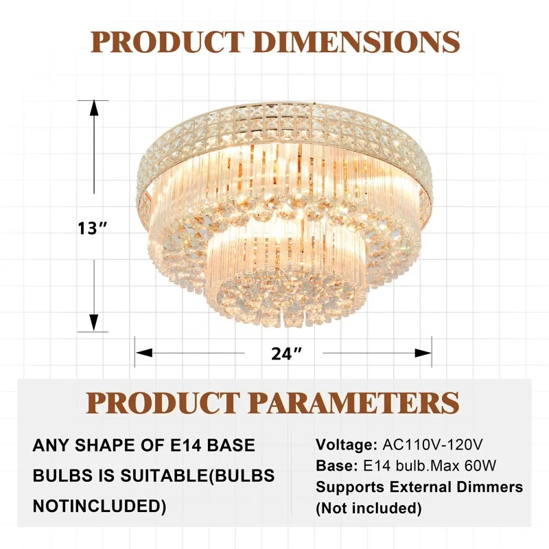 23.6" K9 Crystal LED Chandelier with Remote – Modern Pendant Ceiling Light Specifications: Color: Rose Gold Ceiling Type: Crystal Ceiling Material: Crystal+ ABS + metal chassis Light source type: Incandescent LED energy-saving lamps The number of light source: Leds Light source: E14 Bulb ,without light bulbs Switch: Remote Control Size: width: 60cm/23.6inch *height:30cm/11.7inch Voltage: 110V ~ 120V (inclusive) Power: 31W (including) -40W (inclusive) Application of space: Living room dining room den bedroom other / other small bedroom small living room Note: Requiring assemble. Payment Delivery details Return Contact us About us Payment 1.We accept PayPal,G Pay Credit Card,Visa ,etc. payment. 2. Please make payment within 4 days after placing an order, or eBay will automatically open an unpaid case on the fourth day. 3. You can contact us for sure if you want to cancel the order to avoid the unpaid case. Delivery details Your goods will be shipped within our handling time after your full payment. Pls note that we don't ship to Alaska, Hawaii and Puerto Rico.APO/FPO’s address. Return We accept return within 30 days, but we are not responsible for human damage.The return shipping cost is the buyer's responsibilities and try to keep it in your original package. Contact us If you have any questions please contact us through "Ask seller a question" link. We will respond within 2 business day or less. About us We are committed to providing you with a comfortable home and by functional and beautiful ceiling fans and lighting fixtures. As a professional modern lighiting fixture supplier, our team has more than 15 years Ceiling fan and lighting production experience. We are not only committed to produce high-tech, stylish, safe and high quality LED products, but also provide our professional and efficient after-sales service, making your lighting experience more pleasant and comfortable.