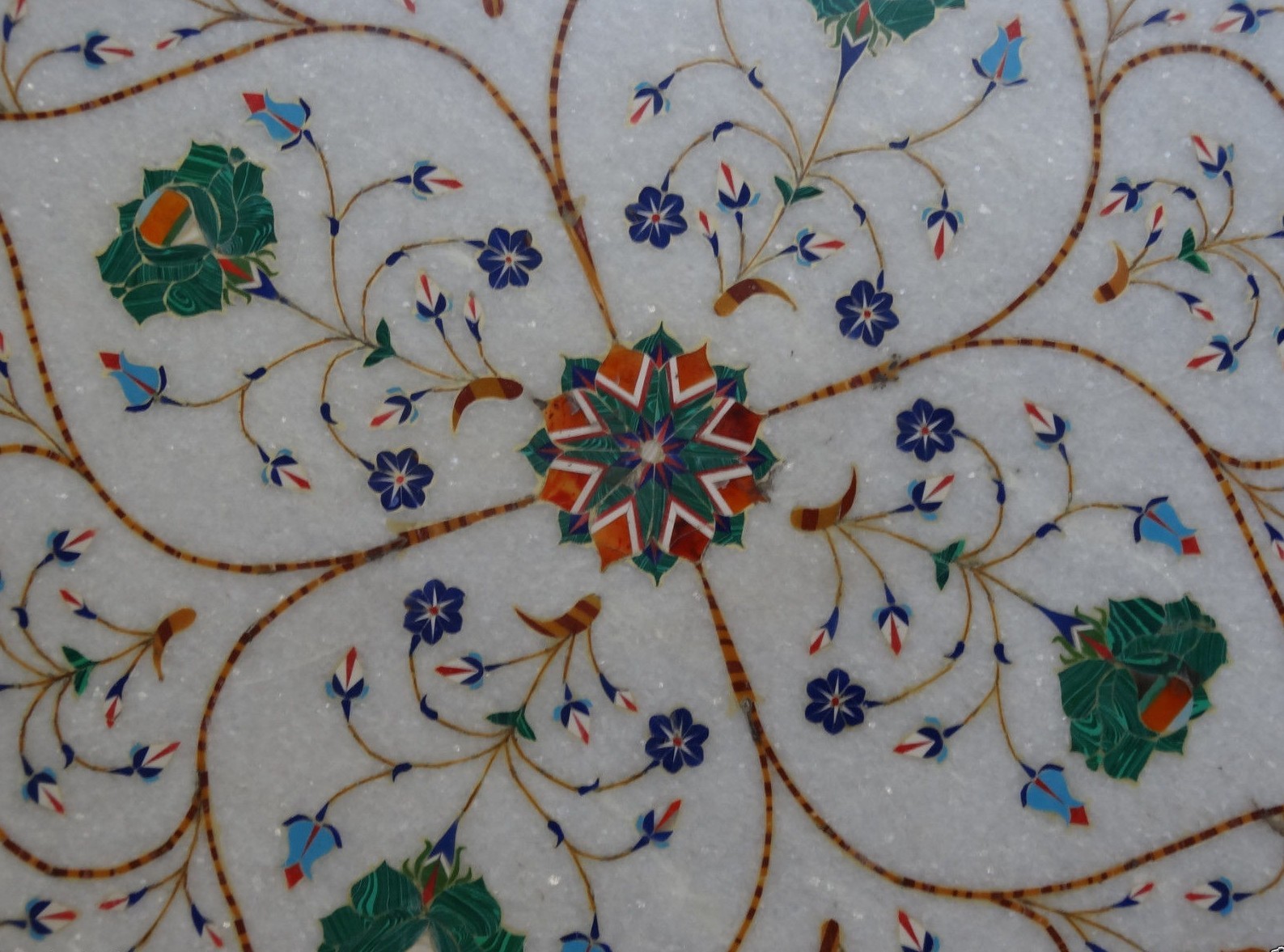 What is Inlay Art? One of the most attractive work of art that comes from marble is"Marble Inlay" work. It is the same work that adorns the Taj Mahal and other Mughal monuments. It is a closely protected traditional art and only a few expert exponents are available today. The delicate process involves cutting and engraving marble shapes manually. To start with, a predefined pattern e.g., floral design or geometrical design is engraved on the marble slab. Small pieces of marble of different shades are cut delicately to fit in these grooves precisely. These small pieces are then slipped in the grooves. Apart from marble, many other materials can also be used. History Of Inlay Art Inlay work on delicate precious stone began in the workshops of Florence in Italy around the end of the 16th century. This was known as PIETRA DURA.(Pietra= Stone, Dura= Hard) The Italians had created a classic artistic form and held a monopoly over it. From 1630 onward pietra dura appeared on movable, small objects as decorative panels, with bird and flower motifs, suitable for cabinet fronts and table tops. Some of these soon reached the Mughals in the form of presents. Of all the Mughal Emperors, Shah Jahan was the greatest patron of architecture in India. For him no amount of money or time was too much to create enduring, everlasting architectural beauty and through it be remembered always. It is in his buildings that one feels most compelled to make the connection between Mughal art and pietra dura. The Taj Mahal, the cenotaphs of the Emperor and his wife, the main floor and the surrounding marble railings bear very close resemblances to the pietra dura form. Process of Marble Inlay Art Master Craftsman carefully plans a design, which is etched lightly into the marble surface and later scored out with an iron chisel. Many of the tools of the trade are basically the same as those used by the Mughals hundreds of years ago. He then decides on the colour scheme depending on the requirements of piece being created. Semi-precious stones and gems are expertly chosen to give just the right graduation in colour and shade for the overall radiance of the pattern. They are shaped and polished by means of an emery wheel. Sometimes heat treatment is applied to certain stones to get a shading effect. The effort involved in making just one single flower can often take days of work, depending on the detail; it is not unusual to be designed from hundreds of different slices of stone. There are many varieties of coloured stone available for utilisation in marble inlay work: malachite, cornelian, jasper, mother of pearl, abalone shell, lapis lazuli, agnate, coral, turquoise and tiger eye to name just a few. The grooves are filled with their precisely corresponding shapes of coloured stone and secured in place with a white putty made from oil, and wax. Once the design is completely dry, the piece is polished with a mixture of sand, water and emery paper to give a shiny smooth finish. Note:- Customs Duty and other duties levies in destinations country are responsibility of the buyer. . Note:- Customs Duty and other duties levies in destinations country are responsibility of the buyer