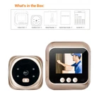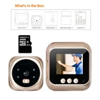 Features: *2.4 inch screen indoor doorbell with one outdoor IR peephole camera. *160°wide viewing angle, almost can see the whole environment of the outdoor. *Support photo taking, video recording, maximum support 32G TF card(not included). *Night vision function, clear viewing even in the darkness. *Intelligent adaptive system optional: at home mode, leave home mode and no disturb mode. *Supports 4*AAA batteries (not included) *Don't Disturb: The doorbell won't ring when this function is enable. * 24-hour monitoring. * Infrared light: 4 infrared LED lights with night vision function. The LED will turn on automatically in dark light. Specifications: Display: 2.4" inch screen Resolution: 1080P 2 million high-definition pixels Support 3 kinds of ringtones, support 8 levels of volume adjustment Support 12 languages Can take pictures, can video, can display the date Indoor Host Power Supply: 4*AAA batteries (not included) View Angle: 160° Doorbell: Support Night Vision: Support TF Support: Max. 32G The memory card we made is 32G Color: Gold Suitable Peephole: 15~60mm Suitable Door Size: 40~100mm Indoor Host Size: 22*97*97mm Outdoor Peephole Camera Size: 65*65mm Package Includes: 1 x Indoor Host 1 x Peephole Camera 1 x Bag of Board and Mounting Screws 1 x User Manual(English)
