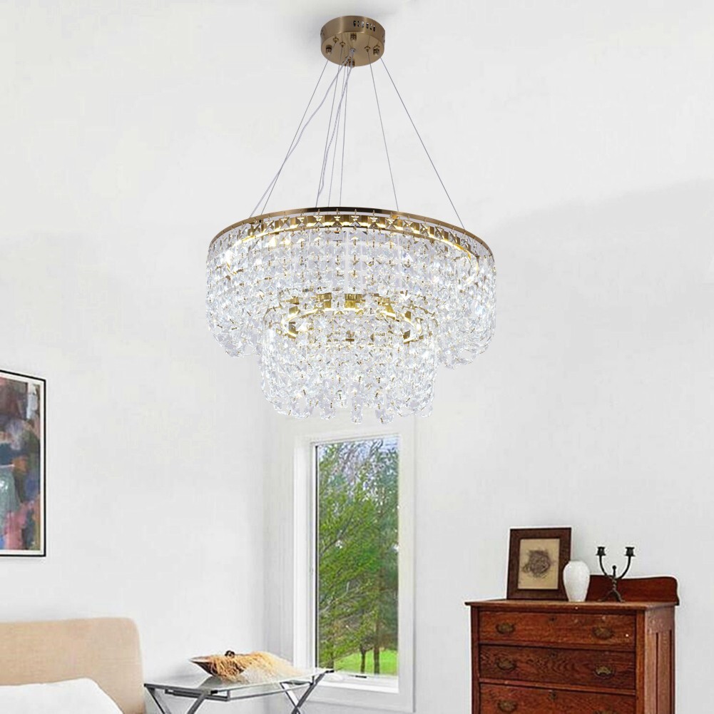 24" 2-Layers K9 Crystal Chandelier Luxury Tassels Pendnat Lamp 3-Color LED Light About this item 【Golden Dual-Tier Crystal Chandelier】 This chandelier is a masterpiece of modern elegance, featuring a golden iron frame adorned with two layers of sparkling clear crystal. The upper layer, with a diameter of 23.6 inches, and the lower layer, at 14.2 inches, create a stunning visual effect that adds a touch of luxury to any room. 【LED Dimmable Lighting】Experience the ultimate in lighting flexibility with our built-in LED lights, offering three-color dimming controlled via a wall switch. Easily adjust the ambiance to match your mood, whether you're hosting a dinner party or enjoying a quiet evening at home. 【Versatile Installation】With an adjustable chain length of 57.1 inches, this chandelier can be customized to fit any ceiling height, ensuring a perfect fit in your space. The ceiling plate, measuring 5.9 inches in diameter, provides a secure and elegant installation. 【Ideal for Multiple Spaces】This chandelier is designed to enhance the lighting in a variety of settings, from dining rooms and living rooms to kitchen islands, foyers, bedrooms, and hallways. Its versatile design makes it a perfect addition to any room in your home, adding a touch of sophistication and style. 【Easy Installation and High-Quality Materials】Crafted from durable iron and clear crystal, this chandelier is built to last. The package includes all necessary hardware for easy installation, ensuring a hassle-free experience. Our commitment to high-quality materials and craftsmanship guarantees your satisfaction. PRODUCT INTRODUCTIONS: This stunning dual-tier crystal chandelier is a perfect blend of modern elegance and timeless luxury. Crafted with a golden iron frame and adorned with two layers of high-quality clear crystal, it exudes sophistication and charm. The upper crystal layer has a diameter of approximately 23.6 inches, while the lower layer measures about 14.2 inches. The crystal refracts light beautifully, creating a dazzling display of colors that enhances any space with a touch of romance and elegance. The chandelier's modern design is both simple and stylish, making it an ideal centerpiece for a variety of home decor styles. Whether you're looking to illuminate your dining room, living room, bedroom, or kitchen, this chandelier will add a touch of luxury and class. SPECIFICATION: Style: Modern & Luxury Chandelier Color: Gold Shade Color: Clear Materials: Iron, Clear Crystal Size: Diameter 23.6 inches, Height 61 inches (Approximately 60 cm x 155 cm) Canopy Size: Diameter 5.9 inches (Approximately 15 cm) Wire Rope: Length 57.1 inches (Approximately 145 cm, Height is Adjustable) Use For: Dining Room, Living Room, Bedroom, Kitchen, Foyer, etc. WARM TIPS: Check Dimensions: Please verify the dimensions before placing your order to ensure the chandelier fits your space. Installation Instructions: Carefully review the installation instructions before proceeding with the installation. Safety First: Ensure the fixture is disconnected from mains power before installation to avoid any electrical hazards. Payment Delivery details Terms of sales About us Contact us Payment We only accept several paymeny ways as follow: Delivery details Your goods will be shipped within our handling time after your full payment. This excludes these locations: Alaska, Hawaii and Puerto Rico.APO/FPO’s are definitely excluded. Terms of sales Return: We accept return within 30 days,but we are not responsible for human damage.The return shipping cost is the buyer's responsibilities and try to keep it in your original package. About us We are selling all kind of ceiling fan,crystal chandelier,pendant lights in high quality with best discounted price. Our goal is providing all our customers 100% satisfaction and best customer service. Contact us If you have any questions please contact us through "Ask seller a question" link. We will respond within 2 business day or less.