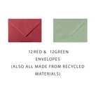 Stylish and contemporary recycled Christmas card set, send a message this year using eco friendly cards. Both the cards and the envelopes are made from recycled paper making them a better alternative to send to your friends and family than a lot of other cards. A6 size when folded: 4.1 x 5.8 inch 12 recycled red and 12 recycled green envelopes which will make your Christmas cards look and feel a little different from a standard letter. 24 cards, six designs and 4 copies of each design. Great value eco friendly cards.