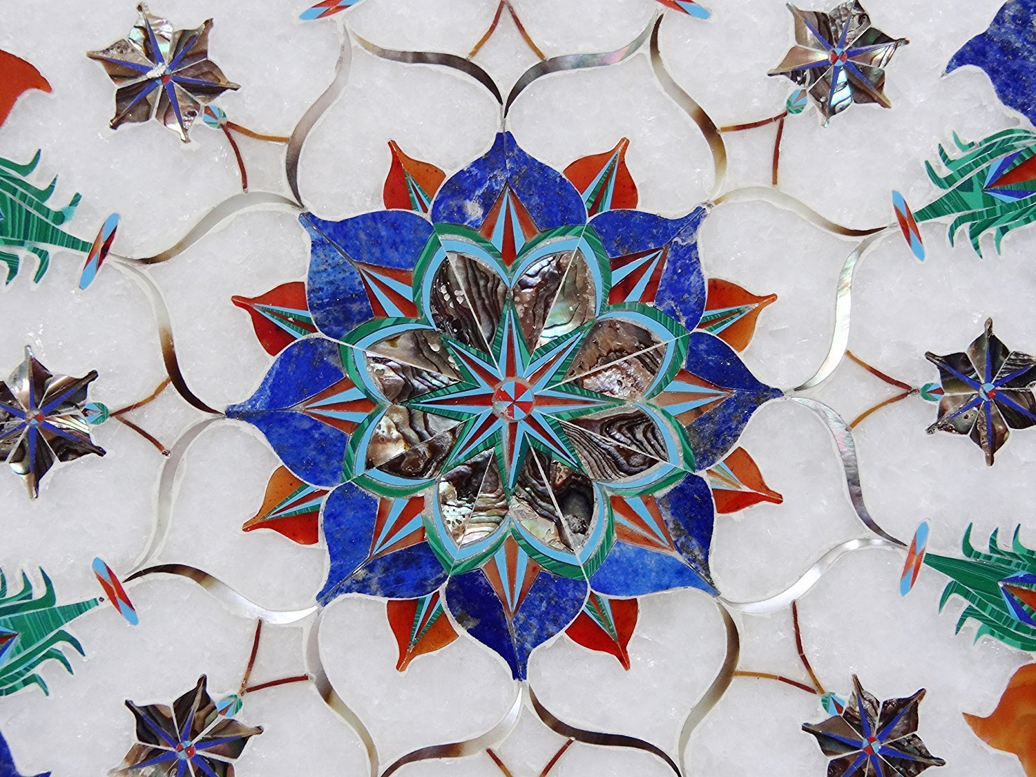 What is Inlay Art? One of the most attractive work of art that comes from marble is"Marble Inlay" work. It is the same work that adorns the Taj Mahal and other Mughal monuments. It is a closely protected traditional art and only a few expert exponents are available today. The delicate process involves cutting and engraving marble shapes manually. To start with, a predefined pattern e.g., floral design or geometrical design is engraved on the marble slab. Small pieces of marble of different shades are cut delicately to fit in these grooves precisely. These small pieces are then slipped in the grooves. Apart from marble, many other materials can also be used. History Of Inlay Art Inlay work on delicate precious stone began in the workshops of Florence in Italy around the end of the 16th century. This was known as PIETRA DURA.(Pietra= Stone, Dura= Hard) The Italians had created a classic artistic form and held a monopoly over it. From 1630 onward pietra dura appeared on movable, small objects as decorative panels, with bird and flower motifs, suitable for cabinet fronts and table tops. Some of these soon reached the Mughals in the form of presents. Of all the Mughal Emperors, Shah Jahan was the greatest patron of architecture in India. For him no amount of money or time was too much to create enduring, everlasting architectural beauty and through it be remembered always. It is in his buildings that one feels most compelled to make the connection between Mughal art and pietra dura. The Taj Mahal, the cenotaphs of the Emperor and his wife, the main floor and the surrounding marble railings bear very close resemblances to the pietra dura form. Process of Marble Inlay Art Master Craftsman carefully plans a design, which is etched lightly into the marble surface and later scored out with an iron chisel. Many of the tools of the trade are basically the same as those used by the Mughals hundreds of years ago. He then decides on the colour scheme depending on the requirements of piece being created. Semi-precious stones and gems are expertly chosen to give just the right graduation in colour and shade for the overall radiance of the pattern. They are shaped and polished by means of an emery wheel. Sometimes heat treatment is applied to certain stones to get a shading effect. The effort involved in making just one single flower can often take days of work, depending on the detail; it is not unusual to be designed from hundreds of different slices of stone. There are many varieties of coloured stone available for utilisation in marble inlay work: malachite, cornelian, jasper, mother of pearl, abalone shell, lapis lazuli, agnate, coral, turquoise and tiger eye to name just a few. The grooves are filled with their precisely corresponding shapes of coloured stone and secured in place with a white putty made from oil, and wax. Once the design is completely dry, the piece is polished with a mixture of sand, water and emery paper to give a shiny smooth finish. Note:- Customs Duty and other duties levies in destinations country are responsibility of the buyer