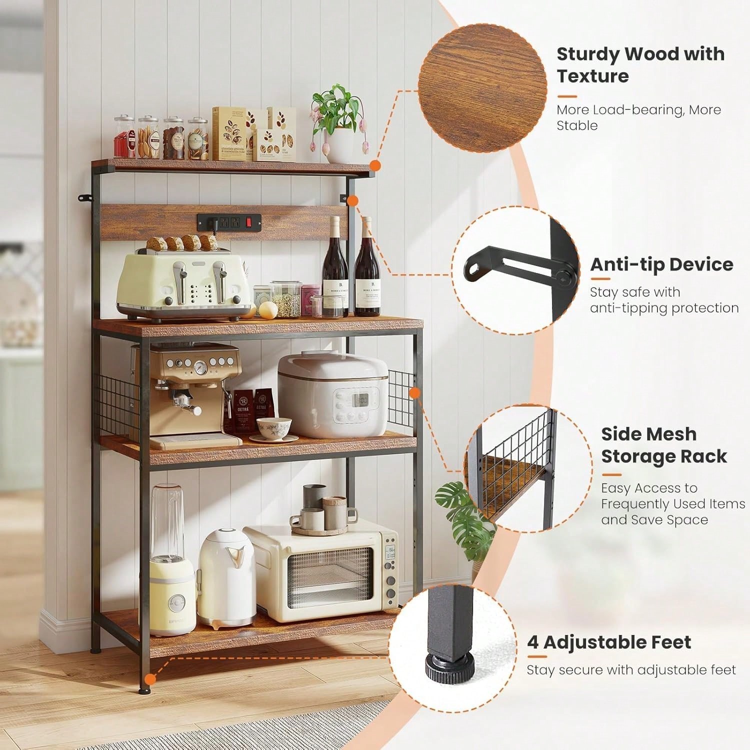 β Maximize Your Kitchen Space with Industrial Style! β Elevate your home organization with the Sweetcrispy 4-Tier Kitchen Bakers Rack . This compact yet powerful storage station is designed to be the heart of your kitchen or dining area. Featuring a built-in power outlet and a sleek rustic brown finish, it functions perfectly as a dedicated coffee bar, a sturdy microwave stand, or a versatile appliance organizer. Ideal for apartments and small kitchens! π³πβ¨ π Key Features You'll Love Built-in Charging Station: Equipped with an integrated power strip featuring 2 AC outlets and 2 USB ports , allowing you to power your coffee maker, toaster, and phone all in one place. πβ‘ Massive 4-Tier Capacity: Offers four vertical levels of storage to neatly arrange your microwave oven, spice jars, cookbooks, and heavy kitchen appliances. Adjustable Storage: The middle shelves are height-adjustable , giving you the flexibility to store taller items like blenders or oversized air fryers with ease. π Superior Stability: Engineered with a reinforced heavy-duty metal frame and high-quality thickened boards to ensure a wobble-free experience under heavy weight. πͺ Space-Saving Design: The 24-inch width is perfectly sized for narrow corners while providing maximum vertical storage efficiency. π Industrial Chic: The Rustic Brown wood-grain finish paired with a matte black frame adds a trendy industrial aesthetic to your home decor. πΏ π Product Specifications Feature Details Brand Sweetcrispy Tiers 4-Tier Vertical Storage Power Outlet 2 AC Outlets + 2 USB Ports Material Premium Engineered Wood & Alloy Steel Color Rustic Brown / Black Width 24 Inches Special Feature Adjustable Shelves & Side Hooks π‘ Multi-Functional Use Coffee Bar: The perfect height for brewing your morning espresso and storing your favorite mugs. Microwave Station: Safely holds heavy microwave ovens while keeping spices and oils organized above. Office/Study: Can also be used as a printer stand or a stylish bookshelf for your home office. π¦ Package Includes: 1 x 4-Tier Kitchen Bakers Rack (24" Wide) 1 x Integrated Power Strip Assembly Hardware Kit & S-Hooks Clear Instruction Manual