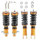 Features - 24 Step to adjust soft / hard adjustment according to your preference - Ride Height Adjustable - Drops From 1 to 3 Inch From Factory Ride Height - 55CrSi high strength durable cold wound steel & heat treated coils - Manufactured from high quality T-6061 billet aluminum with an anodized finish for superior strength and corrosion protection. - Improved Handling and stability without premature tire wear - Improved Vehicle Stability and traction in hard cornering situations - Full threaded absorber tube casing for independent height adjustment - Twin-Tube System for Comfortable Ride on Streets Application For Honda Civic / CRX 1988-1991 EE EF EC For Honda Civic 1992-1995 EJ EG EH fork type For Honda Civic 1996-2000 EK For Acura Integra 1990 -1993 DA DB fork type For Acura Integra 1994-2001 Specifications - Front and Rear top mount: rubber - Damping: 24 levels rebound damping adjustable - Spring rate Front: 8 kg/mm (448 lbs/in) - Spring rate Rear: 5 kg/mm (280 lbs/in) - Spring length Front: 180mm - Spring length Rear: 180mm - Adjustable height: lowering 1-3inch - Coilover overall length Front: 365mm-410mm - Coilover overall length Rear: 435mm-480m - Shock type: Twin tube - Spring Preload: 7-10 mm Package included - Complete 2 Front + 2 Rear coilovers - A pair of wrenches for height adjustment - For some vehicles, you will need sleeves and washers that already included in our package.