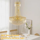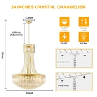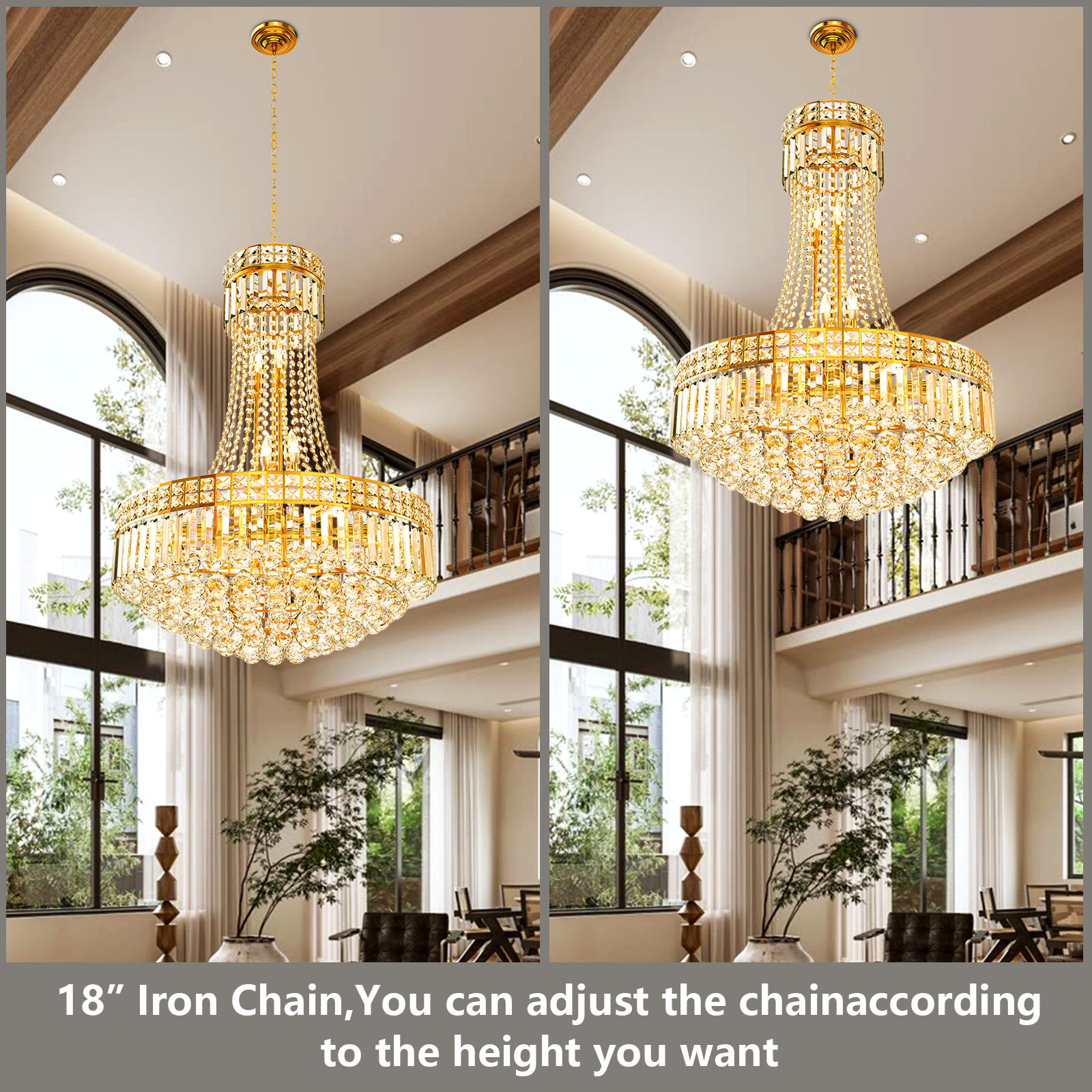 24'' Luxury Gold Chandelier K9 Crystal Raindrop Empire Pendant Light Fixtures About this item 【French Empire Crystal Chandelier】This modern crystal foyer chandelier is using first-class K9 crystals which have great transmission of light, turning on the light will looks very dazzling and charming, this raindrop chandelier is a gorgeous ceiling light fixture that is far more stunning than the picture, making it to be a centerpiece in any spaces 【Gold Chandeliers Dimension】Light Fixture Dia 24" x Height 53"(Max). The hanging light chain is adjustable and the length is 17.7", Canopy Size: 5.3'', you can easily adjust the height according to your ceiling height. Large foyer chandelier looks perfect on high ceilings, compatible with any flat, sloped, slanted, and vaulted ceilings 【Light Source Required】This french empire raindrop chandelier requires 13 x E14 base bulb, Max to 60W(bulbs are not included), Voltage: 110V, compatible with Incandescent, Fluorescent, LED, smart bulbs etc. Fully dimmable when used with dimmable bulb and a compatible dimmer switch 【Wide Application】 This crystal chandelier is ideal for the living room, dining room, kitchen island, bedroom,restaurant, when you turn on the light, the gold chandelier light fixture lighting will reflect through the crystal, adding a romantic, fancy and shining atmosphere to your space 【Warranty】Offers 60 days return service for any damaged or defective product, and free replacement for any non-working or broken part in five year. If you have any problem, please feel free to contact us, we will handle it within 24 hours PRODUCT INTRODUCTIONS: The golden finish empire style chandelier light fixture features 6 layers of sparkling crystals shades to create a stunning display of refraction, and with the firm metal contruction, durable and long lifespan. it looks more textured and expensive than the picture, the luxury raindrop K9 crystal pendant lighting is a perfect decor for dining room, living room, kithen, foyers, entrance, hallways and ect. SPECIFICATION: Style: Empire Chandelier Color: Gold Material: Metal, Crystals Crystal layer: 6 layers Crystal shade color: Clear Size after installation: Dia 24 inch * height 53 inch (Max-Length is Adjustable) Chian Length: 17.7 inch, Adjustable Voltage: 110V Light Source: E14 *13pcs (excluding light source) Light Bulb Type: Incandescent,LED,CFL etc Suitable Room Styles: Modern Antique Vintage WARM TIPS: WE SUGGEST INSTALLATION BY A PROFESSIONAL TECHNICIAN. 1. Please check the dimensions before ordering, just to ensure it is suitable for your room. 2. Please check carefully the installation instructions before you are ready to install the chandelier. 3. Ensure the fixture is disconnected from mains power before installation. Payment Delivery details Return Contact us About us Payment 1.We accept PayPal,G Pay Credit Card,Visa ,etc. payment. 2. Please make payment within 4 days after placing an order, or eBay will automatically open an unpaid case on the fourth day. 3. You can contact us for sure if you want to cancel the order to avoid the unpaid case. Delivery details Your goods will be shipped within our handling time after your full payment. Pls note that we don't ship to Alaska, Hawaii and Puerto Rico.APO/FPO’s address. Return We accept return within 30 days, but we are not responsible for human damage.The return shipping cost is the buyer's responsibilities and try to keep it in your original package. Contact us If you have any questions please contact us through "Ask seller a question" link. We will respond within 2 business day or less. About us We are committed to providing you with a comfortable home and by functional and beautiful ceiling fans and lighting fixtures. As a professional modern lighiting fixture supplier, our team has more than 15 years Ceiling fan and lighting production experience. We are not only committed to produce high-tech, stylish, safe and high quality LED products, but also provide our professional and efficient after-sales service, making your lighting experience more pleasant and comfortable.