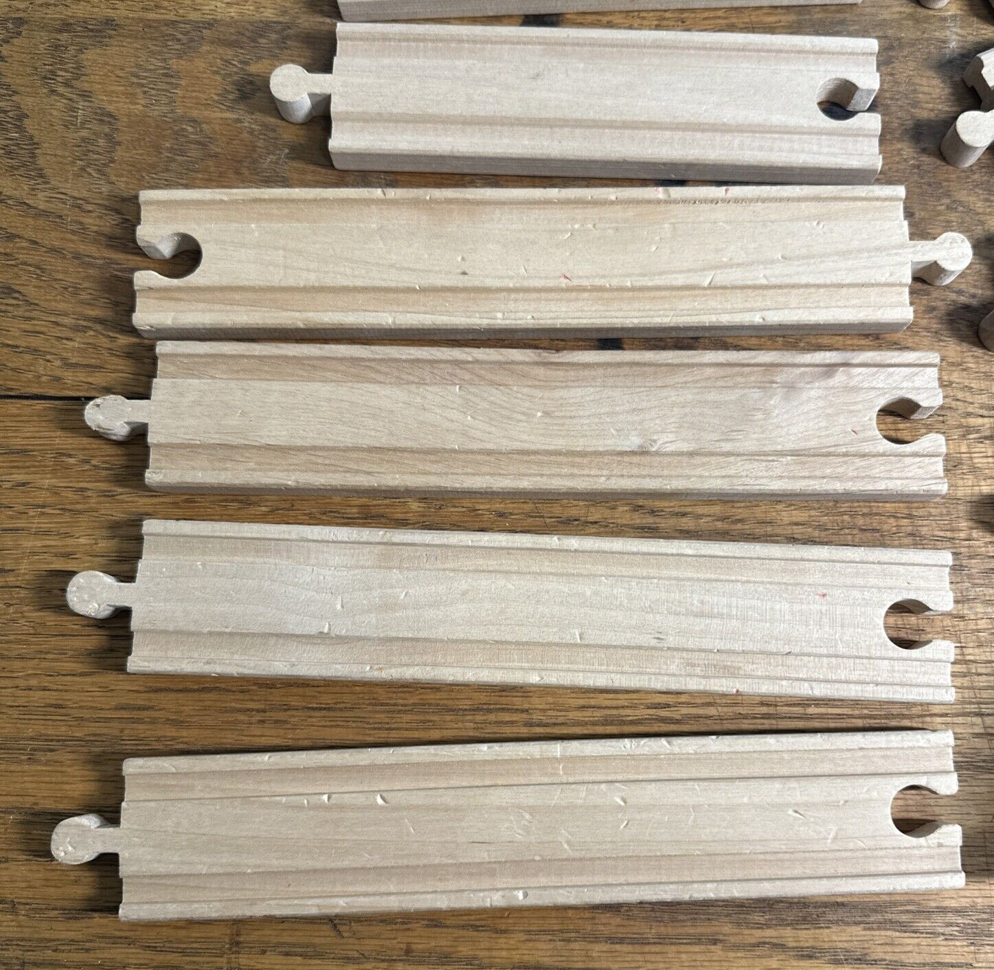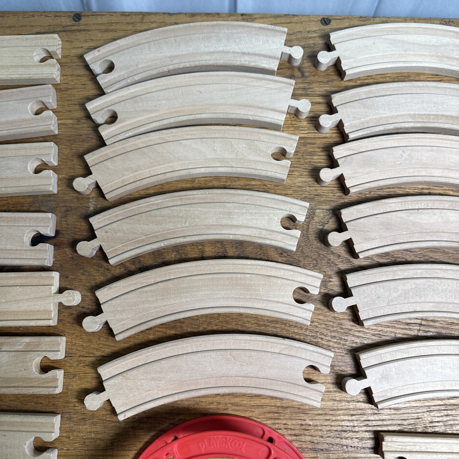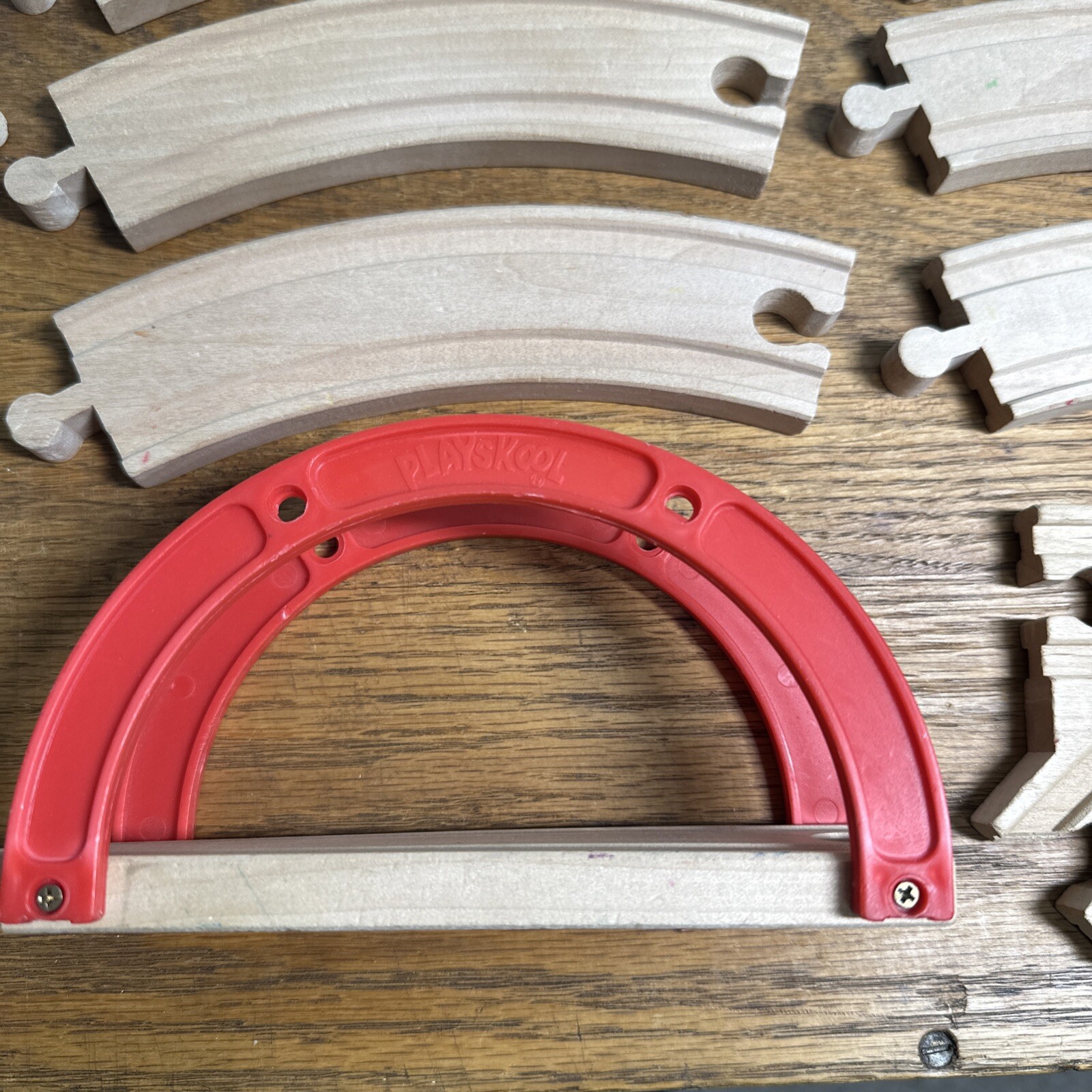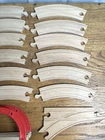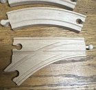 This lot consists of 24 wooden train track pieces in various sizes and shapes, including a bridge, all designed for Thomas & Friends Wooden Railway playsets. The tracks are beige in color and are perfect for creating a realistic train track layout for imaginative play. Made of durable wood, these tracks are suitable for train enthusiasts and collectors looking to expand their railway setups. Tracks are not branded. Bridge is branded "Playskool." Pre-owned conditions. See photos. Straights: 4-8.5", 2-6", 2-5.5", and 2-2" 12- Curves 1- Bridge 6" 1-Split 5.5"