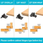 1/2" Overlay Kitchen Cabinet Door Hinges Black Self Closing Cabinet Hinge Hardware for Kitchen Cabinet Doors Our Cabinet Hinges are suitable for your overlay cabinet doors in kitchen and bathrooms. Overlay Hinges provide long-lasting durability, a soft closing, and the reinforced strength to outlast even the roughest kitchens or bathrooms. Important Note: These are overlay hinges not inset hinges. There is a big difference so please know what you are buying. Overlay means your cabinet door "overlays" (or overlaps) the cabinet frame and thus the door is perfectly flat on both front and back. A type of overlay is a Variable Overlay, these only come in a face mount. These are called Variable Overlay because your door does not have to overlap your frame by a set dimension (such as 1/2in. or so). 【1/2 INCH OVERLAY CABINET HINGE】- 1/2" overlay cabinet hinges are fit for frame cabinet in kitchen, bathroom and other cupboard doors, please confirm the cabinet door type and measure before choosing the proper hinges for your face frame cabinet. 【DURABLE KITCHEN CABINET HINGES】- The 1/2" overlay semi-concealed hinges are made of 1.5mm thick metal for strength and sturdiness. These solid cabinet door hinges still remain smooth opening and closing after years of uses. 【SELF CLOSING CABINET HINGES】-The cabinet door will automatically close when the kitchen cabinet hinges closure angle is less than 30°. Just gently push the cabinet doors and the hinges will be self-closing. 【EASY INSTALLTATION】- Black cabinet hinges attaching to the surface of the cabinet door do not require any mortise, which make installation are easy and fast. Each cabinet hinge come with 5 mounting screws 【PACKAGE】- Include 24 Pack 12 Pairs black 1/2 inch overlay semi-concealed cabinet hinges with installation screws.(Each pair of cabinet hinges is individually wrapped)
