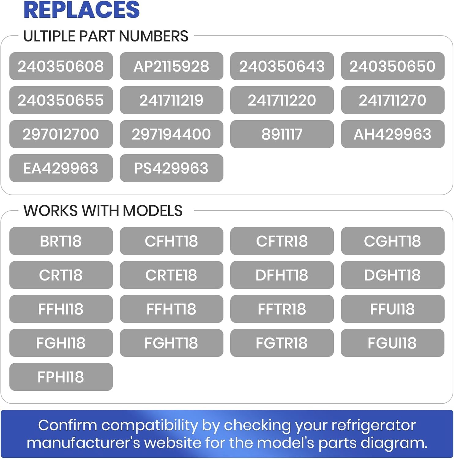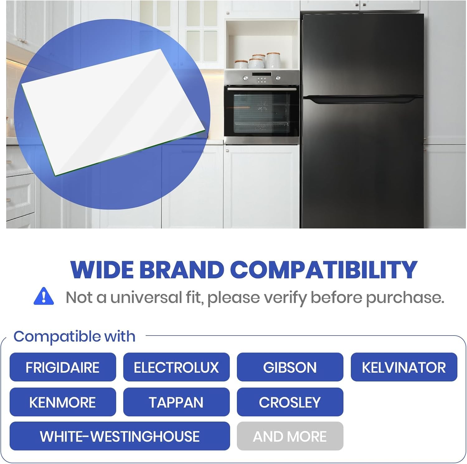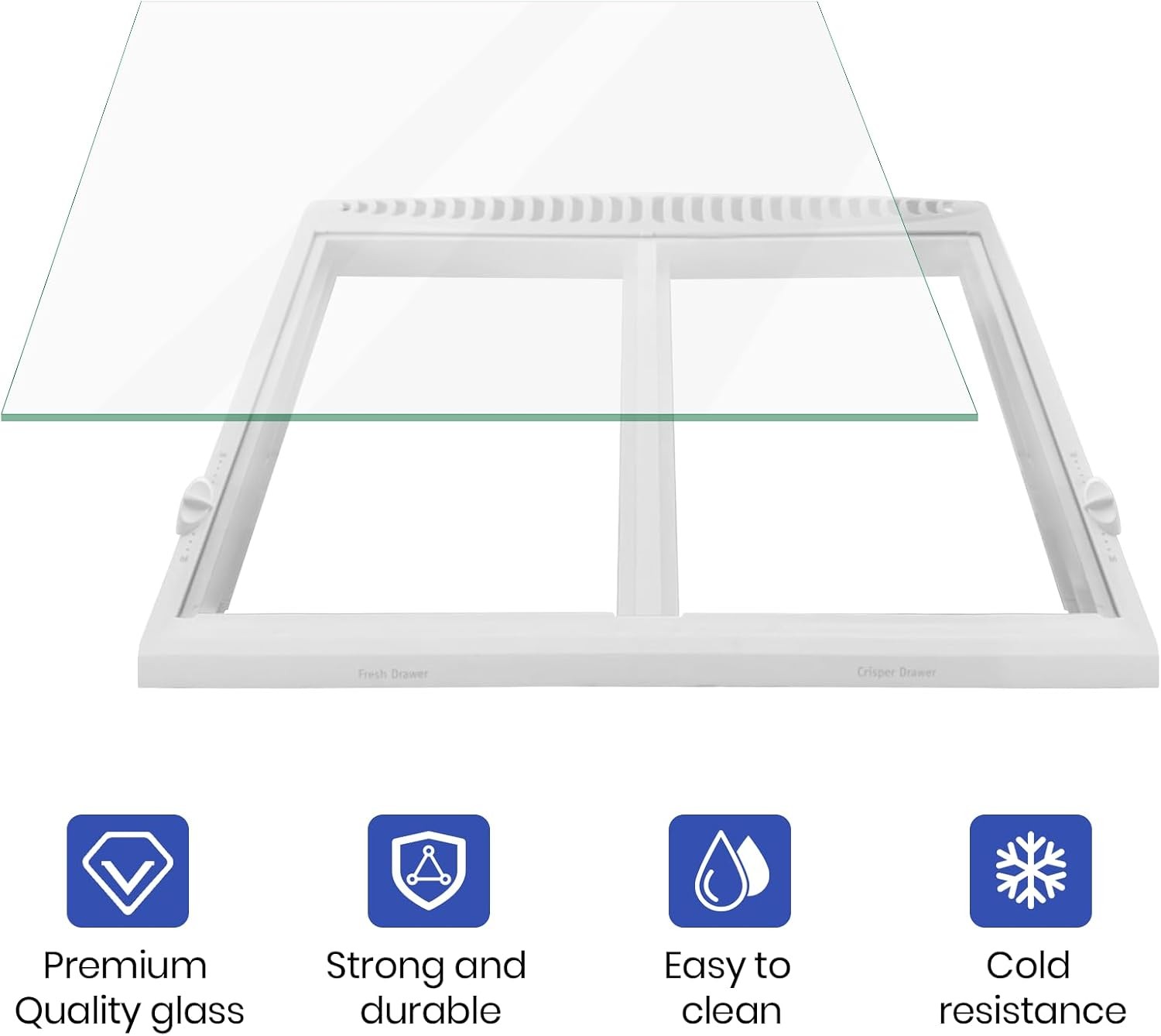 240350608 Crisper Glass Pan Cover Insert Compatible with Frigidaire Refrigerator Our refrigerator glass pan cover insert is a perfect replacement for crisper pan frame if your glass is missing or broken. Perfect for shelf / shelves / drawer replacement. Compatible with following Make(s): Frigidaire , Electrolux , Gibson , Kelvinator , White-Westinghouse , Kenmore , Tappan , Crosley , Frigidaire and more Part Number(s): 240350608 / AP2115928 Replacement Part Number(s): 240350650, 240350643, 240350655, 297012700, 297194400, 241711220, 241711219, 241711270, AH429963, EA429963, PS429963 and 891117 Ensure Prosper Fit Before Ordering Product Dimension: 23 7/8'' wide x 15 1/2'' long x 1/8th'' thick inches. Please measure the area in which the glass fits (crisper pan frame, above the crisper) before ordering to ensure a proper fit