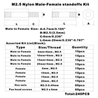 Product description: M2.5 Threaded Hex Male-Female Standoff Spacer Screw Nut Assortment Kit. Material: Nylon. 100% new, RoHS compliant. Package include: M2.5 Hex Male-Female Standoff Spacer Screw Nut total 240 pieces. Come with the plastic box: List(Type,Length / Thread,Quantity): Male to Female 6mm+6mm, M2.5 15pcs Male to Female 10mm+6mm, M2.5 15pcs Male to Female 15mm+6mm, M2.5 15pcs Male to Female 20mm+6mm, M2.5 15pcs Female to Female 6mm, M2.5 15pcs Female to Female 10mm, M2.5 15pcs Female to Female 15mm, M2.5 15pcs Female to Female 20mm, M2.5 15pcs Nylon Nuts M2.5 60pcs Nylon Screw M2.5x6mm 60pcs Packing contents: 240pcs M2.5 Nylon Hex Standoffs Screws Nuts Packed in a plastic box. M2.5 Black Nylon Hex Spacers Standoffs/ Screws/ Nuts Assorted Kit;Total 240 Pieces Come With the Plastic Box Screw Thread: M2.5/(2.5mm), Thread Pitch: 0.45mm;The Male-Female Standoffs Different length:6mm+6mm(15pcs);6mm(15pcs);10mm+6mm(15pcs);10mm(15pcs);15mm+6mm(15pcs);15mm(15pcs);20mm+6mm(15pcs);20mm(15pcs).and Nylon Screws(60pcs)/Nuts(60pcs); The Nylon Standoffs Kit For FPV Quadcopter Building,Arduino,Raspberry-Pi or other projects All Products are Made of Nylon, Strong, anticorrosive. Good Quality.Easy to install