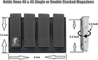 Universal Magazine Pouch for 9mm, .40, and .45 Caliber Magazines Crafted from durable nylon material, this versatile magazine pouch is designed to accommodate a wide range of pistol magazines. Whether you’re a competitive shooter, law enforcement officer, or a concealed carry enthusiast, this pouch has you covered. Here are some of the key features: Compatibility : Fits all major 9mm, .40, and .45 caliber magazines, including popular brands such as Glock, Sig Sauer, Smith & Wesson, Beretta, Taurus, H&K, and more. Adjustable Design : The pouch features an adjustable tension screw, allowing you to customize the fit for different magazine sizes. It securely holds single-stack and double-stack magazines. Durable Nylon Construction : Constructed from rugged nylon, this pouch withstands daily wear and tear. It’s resistant to impact, moisture, and temperature variations. Quick Access : The open-top design allows for rapid magazine retrieval during reloads. No flaps or closures to slow you down. Capacity : Holds magazines simultaneously, making it ideal for both training sessions and real-world scenarios. Here’s a selection of popular 9mm, .40, and .45 caliber magazines that this nylon pouch accommodates: Glock 17, 19, 26, 34 : These 9mm magazines are widely used and fit perfectly in the pouch. Sig Sauer P226, P229 : Both 9mm and .40 S&W magazines from Sig Sauer are compatible. Smith & Wesson M&P Series : Whether it’s the M&P Shield, M&P Compact, or M&P Full Size, this pouch works with them all. Beretta 92FS, PX4 Storm : Beretta enthusiasts can rely on this pouch for their 9mm and .40 magazines. Taurus PT92, PT111 G2 : Taurus owners will appreciate the versatility of this pouch. Heckler & Koch (H&K) VP9, USP, P30 : These 9mm and .40 magazines fit snugly. Springfield XD, XD-M : Both 9mm and .40 magazines from Springfield Armory are compatible. Remember, this is just a partial list. With over 150 compatible models, this nylon pouch ensures you’re always prepared. Whether you’re at the range, on duty, or carrying concealed, trust this magazine pouch to keep your spare magazines secure and accessible.