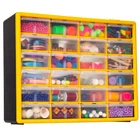 HEAVY DUTY CABINET WITH 24 DRAWERS: The 24-drawer small storage cabinet is made in the U.S.A. from rugged, high-impact plastic and measures 20" W x 6" D x 16" H; Organizer drawers - 6" x 4-1/2" x 2-3/16" GARAGE ORGANIZATION: The small parts organizer is great for garages and workshops for both homeowners and businesses; The plastic storage drawers can be used as tool box, screw organizer or for battery storage; Keep nails and other small parts accessible CLASSROOM ESSENTIALS: Teachers can use the stackable storage drawers for classroom organization; Use it as a teacher toolbox, art supply storage organizer, craft storage cabinet for scrapbook supplies, and more HOME STORAGE AND ORGANIZATION: This plastic storage cabinet offers many uses around the home; It can be a lego storage organizer, craft organizer, or sticker organizer; Use it for makeup storage and organization or for medicine and first aid supplies FEATURES: Stack cabinets securely or use keyhole slots to mount for wall storage; Finger-grip drawer pulls provide easy access; Rear stop tabs prevent contents from spilling; Drawer dividers are included and molded into the back of the cabinet The Akro-Mils 10124 24-Drawer Plastic Storage Cabinet Organizer with Drawers is a great solution for all your storage needs. This heavy-duty cabinet is made in the U.S.A. from rugged, high-impact polystyrene plastic and features 24 large and small plastic drawers offering ample storage space for all your small parts and tools. Plastic organizer drawers inside dimensions: 4-7/8-Inch x 4-1/4-Inch x 2-Inch. Whether you're looking to organize your garage, workshop, classroom, or home, this storage cabinet has you covered. Garage owners and businesses will love the versatility of this cabinet, with the plastic storage drawers perfect for use as a hardware organizer, screw organizer box, or for battery storage. Keep your nails and other small parts accessible with ease. Teachers can use the cabinet for classroom storage, as a teacher toolbox, art storage, craft storage box, for scrapbook supplies, and more. This plastic storage cabinet is also perfect for home storage and organization. Use it as a lego organizer, craft organizer, hobby organizer, or bead storage organizer. It's even great for makeup storage and organization or for medicine and first aid supplies. And with the ability to stack cabinets securely or wall-mount them using keyhole slots, along with finger-grip drawer pulls and rear stop tabs to prevent contents from spilling, this cabinet has everything you need to keep your items safe and organized. Cabinets have 8 small crosswise dividers and 4 large length dividers included. Included dividers are molded into the back of the cabinet (remove with scissors). Additional dividers can be purchased separately.