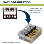 HEAVY DUTY CABINET WITH 24 DRAWERS: The 24-drawer small storage cabinet is made in the U.S.A. from rugged, high-impact plastic and measures 20" W x 6" D x 16" H; Organizer drawers - 6" x 4-1/2" x 2-3/16" GARAGE ORGANIZATION: The small parts organizer is great for garages and workshops for both homeowners and businesses; The plastic storage drawers can be used as tool box, screw organizer or for battery storage; Keep nails and other small parts accessible CLASSROOM ESSENTIALS: Teachers can use the stackable storage drawers for classroom organization; Use it as a teacher toolbox, art supply storage organizer, craft storage cabinet for scrapbook supplies, and more; Drawers are safe for polymer clay HOME STORAGE AND ORGANIZATION: This plastic storage cabinet offers many uses around the home; It can be a lego storage organizer, craft organizer, or sticker organizer; Use it for makeup storage and organization or for medicine and first aid supplies FEATURES: Stack cabinets securely or use keyhole slots to mount for wall storage; Finger-grip drawer pulls provide easy access; Rear stop tabs prevent contents from spilling; Drawer dividers are included and molded into the back of the cabinet Product Description The Akro-Mils 10124 24-Drawer Plastic Storage Cabinet Organizer with Drawers is a great solution for all your storage needs. This heavy-duty cabinet is made in the U.S.A. from rugged, high-impact polystyrene plastic and features 24 large and small plastic drawers offering ample storage space for all your small parts and tools. Plastic organizer drawers inside dimensions: 4-7/8-Inch x 4-1/4-Inch x 2-Inch. Whether you're looking to organize your garage, workshop, classroom, or home, this storage cabinet has you covered. Garage owners and businesses will love the versatility of this cabinet, with the plastic storage drawers perfect for use as a hardware organizer, screw organizer box, or for battery storage. Keep your nails and other small parts accessible with ease. Teachers can use the cabinet for classroom storage, as a teacher toolbox, art storage, craft storage box, for scrapbook supplies, and more. This plastic storage cabinet is also perfect for home storage and organization. Use it as a lego organizer, craft organizer, hobby organizer, or bead storage organizer. It's even great for makeup storage and organization or for medicine and first aid supplies. And with the ability to stack cabinets securely or wall-mount them using keyhole slots, along with finger-grip drawer pulls and rear stop tabs to prevent contents from spilling, this cabinet has everything you need to keep your items safe and organized. Cabinets have 8 small crosswise dividers and 4 large length dividers included. Included dividers are molded into the back of the cabinet (remove with scissors). Additional dividers can be purchased separately. From the Manufacturer 10124 Cabinet stacks securely and can also be wall mounted with keyhole slots. Clarified polypropylene, dividable drawers offer easy content identification. Finger-grip drawer pulls provide easy access and rear stop tabs prevent contents from spilling. Akro-Mils products save time and money by helping to increase material handling efficiency in virtually any industry. Our broad range of storage, organization and transport products are used to shorten assembly times, maintain accurate inventories, optimize storage space and improve parts protection. Our mission at Akro-Mils is a commitment to manufacturing innovative storage and material handling products of uncompromising quality at a fair price. We support this commitment with professional representation and consistent, superior service to meet the needs of our customers. For quality products backed by more than 60 years of reliable delivery and responsive customer service, we invite you to turn to the Akro-Mils advantage
