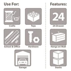 24 Drawer Plastic Parts Storage Hardware and Craft Cabintet for Hardware Beads Features: CABINET DIMENSIONS: 20" x 6-3/8" x 15-13/16", DRAWER DIMENSIONS: 6" x 4-1/2" x 2-3/16" (large drawer) HIGH QUALITY: Heavy-duty, high-impact polystyrene frame and 24 drawers GREAT FOR: Storing and organizing classroom or office supplies, crafts, bead organizer, art supply storage or sewing supplies, hardware, lego and small toy storage, fishing gear and more WALL-MOUNTABLE OR STACK-MOUNTABLE – Cabinets stack securely and can also be wall-mounted using keyhole slots molded into the back of the cabinet DIVIDABLE DRAWERS - 4 drawer dividers are included and are molded into the back of the cabinet, finger grip drawer pulls provide easy access and rear stop tabs prevent contents from spilling Description: Product Description Versatile storage solutions for school, home, garage or office. These sturdy plastic cabinets will organize and protect your small parts, toy blocks, office supplies, crafts, beads, hardware, fishing, classroom supplies and more. Cabinet stacks securely and has keyhole slots for wall hanging. Flexible, strong, clear drawers feature finger-grip pulls. Large Drawer Interior Dimensions: 4-7/8" x 4-1/4" x 2"; Small Drawer Interior Dimensions: 5-1/4" x 1-11/16" x 1-1/2" Keyholes on back for wall hanging and tabs on top and bottom for secure stacking. Cabinets have 8 small cross dividers and 4 long length dividers included. The included dividers are molded into the back of the cabinet (remove with scissors). Additional dividers are sold separately. From the Manufacturer 10124 Cabinet stacks securely and can also be wall-mounted with keyhole slots. Dividable clarified polypropylene drawers offer easy identification of contents. Finger-grip drawer pulls provide easy access and rear stop tabs prevent contents from spilling. If you need more quantity than shown available - just send me a message and I'll increase the purchased limit for you 🌺 SHIPPING We are always working hard to ensure your package arrives as soon as possible. Please understand that some factors like weather, high postal traffic, and the performance of shipping companies are outside of our control. We offer free shipping to the lower 48 states. We don't ship to PO BOX. Provide a physical address. Thank you. Best wishes 🕊 TRANSLATE with x English Arabic Hebrew Polish Bulgarian Hindi Portuguese Catalan Hmong Daw Romanian Chinese Simplified Hungarian Russian Chinese Traditional Indonesian Slovak Czech Italian Slovenian Danish Japanese Spanish Dutch Klingon Swedish English Korean Thai Estonian Latvian Turkish Finnish Lithuanian Ukrainian French Malay Urdu German Maltese Vietnamese Greek Norwegian Welsh Haitian Creole Persian TRANSLATE with COPY THE URL BELOW Back EMBED THE SNIPPET BELOW IN YOUR SITE Enable collaborative features and customize widget: Bing Webmaster Portal Back