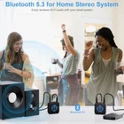 【Quick connection】The wireless audio adapter connection is quicker and more stable than older versions. After connected to power, the transmitter and receiver will automatically power on and enter paring mode and there is a blue ring light to indicate its working state, No more disturbing disconnection and manual re-connection. 【Dual AUX/RCA In/Out】Comes with 3.5mm plug to RCA adapter cable, the audio receiver support simoutaneous AUX/ RCA output for 2 speakers. Connect the transmitter with PC, TV, CD, MP4 output, and connect the receiver with powered speaker, amplifier or home theater, plug and play, easy operation for true wireless audio transmission. Dual AUX and RCA input at the same time is not recommended, as the audio would be mixed up at the receiving end. 【2.4GHz Hi-Fi Audio Enjoyment】The audio adapter kit features 2.4GHz true wireless connection, no more cords, freely enjoy high fidelity music. Very suitable for home TV, PC, MP4 office audio speaker connection, get rid of distance limitation and enjoy high quality stereo streaming audio at every corner of your home. Please NOTE: the audio kit is not suitable for subwoofer. 【260ft Low Latency Syncronization】Designed with anti-interference technology, the transmission distance can reach up to 260ft(80m, no obstacle) and minimum 98ft(30m) for indoor use, enjoy lower than 25ms lantency low noise audio. Please NOTE that the transmitter and receiver can only be connected to each other, cannot be paired with other bluetooth devices. Make the transmitter/ receiver powered with our included power adapter is suggested. 【Compact Size & Quick Button Control】The audio TX/RX has no external antenna and features extremely compact and light design, convenient for carrying. Volume adjusting is available on the transmitter and the receiver, press the volume +/- button to adjust the input or output audio volume individually. Center is the functional button, press once to mute and press 3s to power off, very easy to control while it's working. Warm Tips: This 2.4GHz wireless audio transmitter receiver kit is not Bluetooth. Therefore, this transceiver kit can only connect with each other, it can't be paired with other Bluetooth devices.