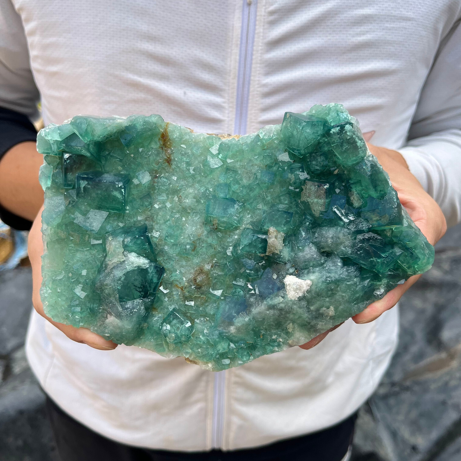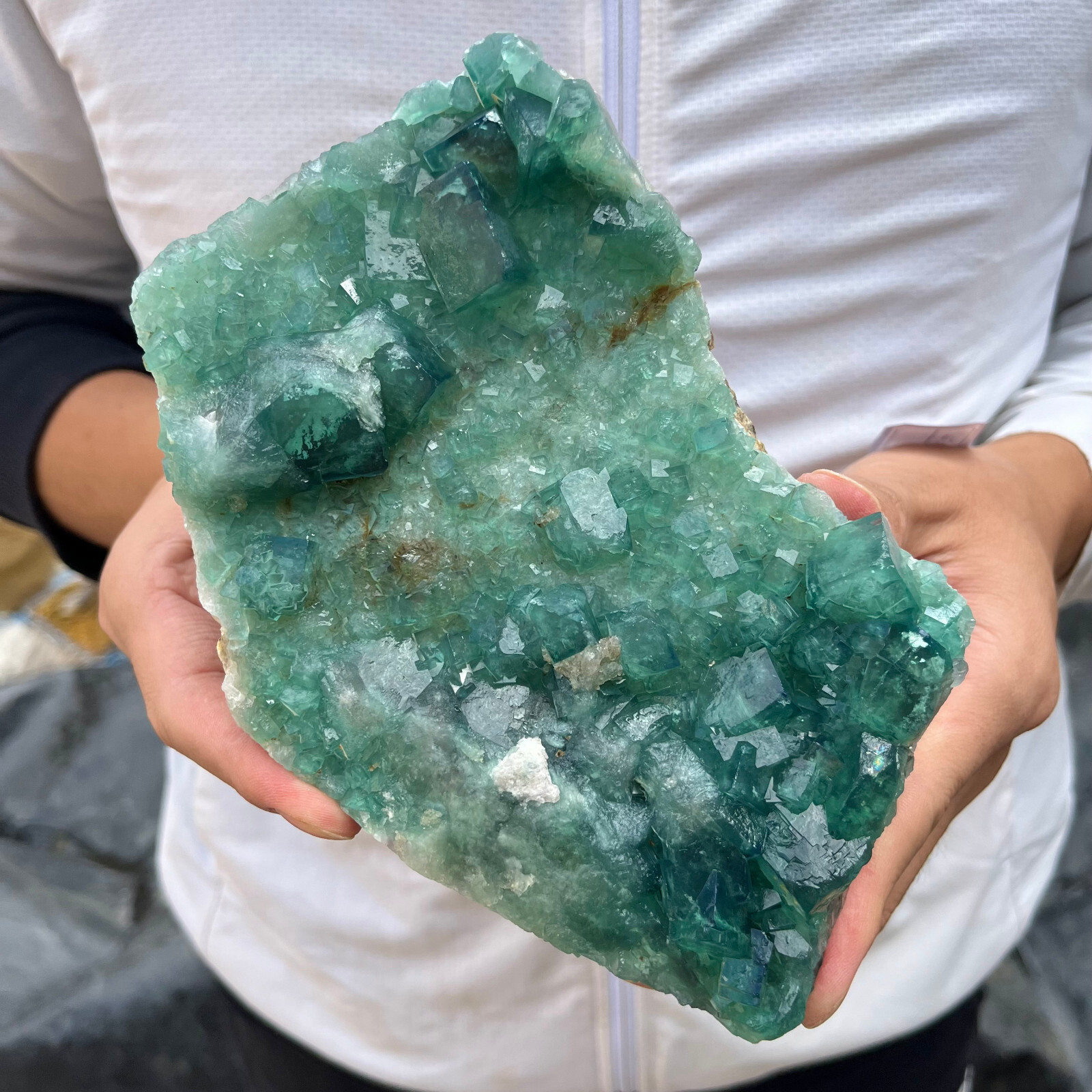 Amazing blue green hues in the fluorite. Item got here super quickly and it was wrapped completely in bubble wrap and tape. It looks exactly like the picture. It’s a solid chonk of a rock with interesting white flecks of crystal on the bottom. A+ transaction!!!