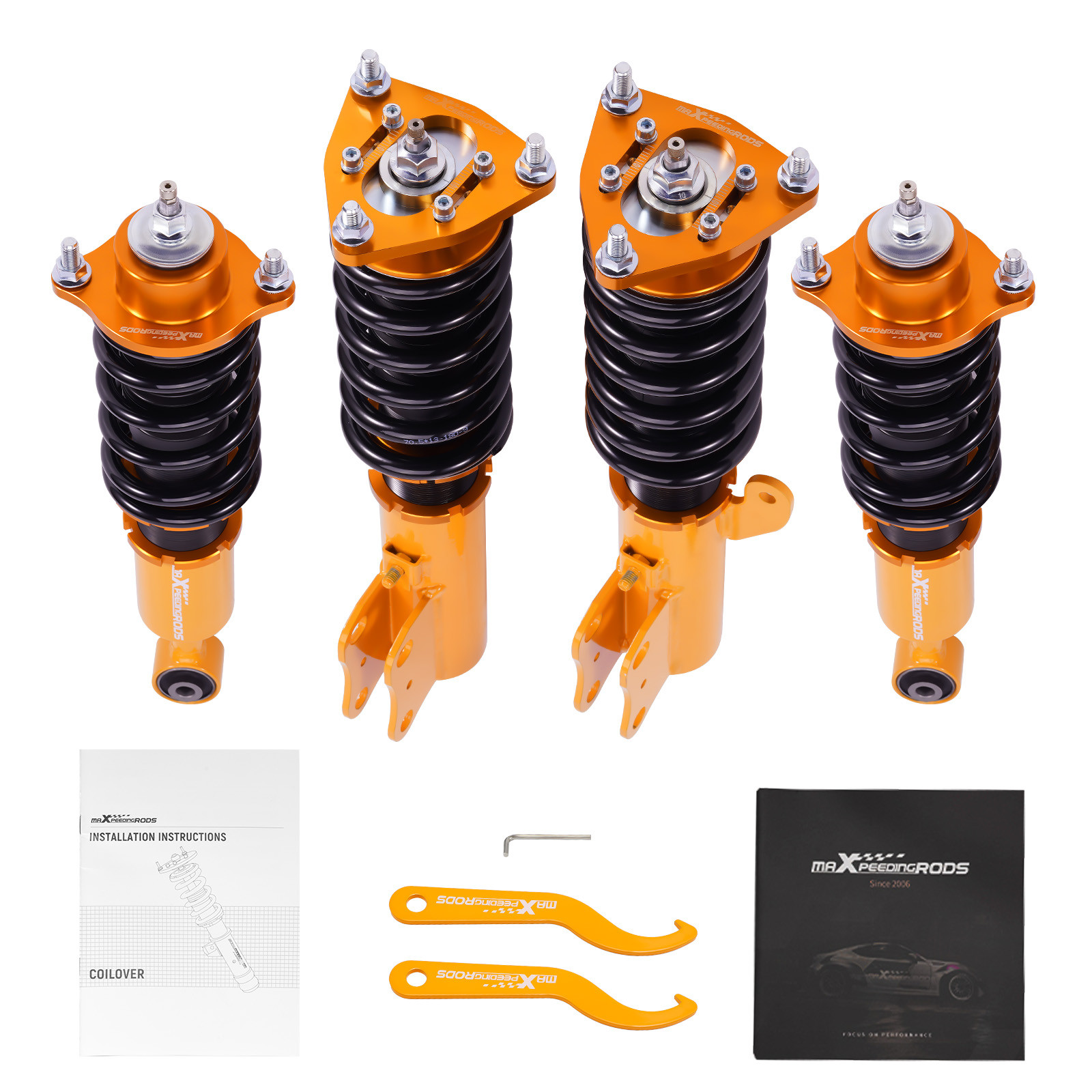 MaXpeedingrods coilover offer excellent, versatile performance, durability and ride comfort over all road conditions. Featuring 24 levels of damping adjustment, the damper can be easily accessed and adjusted via a knob at the top of the damper mount. Simple adjustments can be made to tune to your desired style of driving and comfort level that you desire. This allows you to preset to soft damping for your daily drive and switch to hard damping for track days. Features - 24 Step to adjust soft / hard adjustment according to your preference - Ride Height Adjustable - Drops From 1 to 3 Inch From Factory Ride Height - 55CrSi high strength durable cold wound steel & heat treated coils - Manufactured from high quality T-6061 billet aluminum with an anodized finish for superior strength and corrosion protection. - Improved Handling and stability without premature tire wear - Improved Vehicle Stability and traction in hard cornering situations - Full threaded absorber tube casing for independent height adjustment - Twin-Tube System for Comfortable Ride on Streets Applications For Mitsubishi Lancer(CX/CY) 2008-2016, except Lancer Evolution For Mitsubishi Outlancer Sport(GA) 2011-2020 Specifications - Top mounts:pillow ball top mount front,standard rubber top mount rear. - Damping: 24 levels rebound damping adjustable - Front Spring Rate: 9kg/mm (504 lbs/in). - Rear Spring Rate: 6 kg/mm (336 in/lbs). - Adjustable Height: Yes lowering 1" to 3" - Shock type: Twin tube - Spring Preload: 7-10 mm - Color: Gold Package included 1 x Set of Coilover Spring Kit (2 Front + 2 Rear) 1 x Pair of wrenches for height adjustment ★ 30-day Money Back & 12-Month Replacement Guarantee. Please feel free to contact us if there is any question. MXR04FXJT