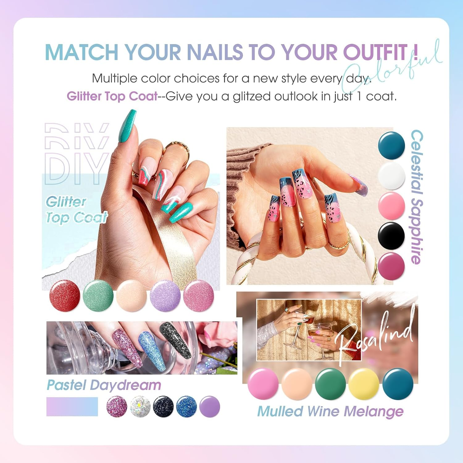 Store New Arrivals Add to Favorite View Feedback Contact Fast deliveries to the customer's home Quality customer service John Make the customers happy! 24PCS Gel Nail Polish Set, 20 Colors Gel Polish with Base Coat and Glitter&Glossy&Matte Gel Top Coat Fall Winter Colors Holiday Nail Gel Description What You Get: ROSALIND 20 colors gel polish (5ml/0.17fl.oz, mini bottles) + glitter top coat + glossy top coat + matte top coat + base coat. ROSALIND all seasons nail gel set contains 20 classic lively and cheerful colors for any season and any scene. Come together to experience the fun of nail art DIY 4 No-Wipe Base, Glossy, Matte and Glitter Top Coat: Compared to traditional gel polish set, with the addition of the glitter top coat gel nail polish, the glitter effect can be seen in every color in the kit, eliminating the need to purchase a special glitter color kit! It's easy to create the perfect manicure at home Easy Application and Good Tenacity: The nail gel polish colors kit is long-lasting for 28+ days with perfect shine under proper application - with base gel top coat throughout the full application process and needs to be cured under LED/U V light for 60-120 seconds Environmental & Healthy: ROSALIND gel nail polish set is made from 9 Toxin-Free Ingredients, making it low-odor. There are no harsh ingredients or adhesives that lead to damaged nails. Avoid contact with eyes, mouth, and skin Best Manicure Gift: ROSALIND gel nail polish set comes with a beautiful gift box. It is a perfect gift for family and friends on birthdays, anniversaries, Valentine's Day, Mother's Day or other holidays. This is a wonderful and unique manicure gift set that will be loved by anyone who receives it Product Description ROSALIND GEL NAIL POLISH SET Add to Cart Add to Cart Add to Cart Add to Cart Add to Cart Customer Reviews 4.3 out of 5 stars 310 4.2 out of 5 stars 22 3.6 out of 5 stars 36 3.6 out of 5 stars 144 4.1 out of 5 stars 57 1.0 out of 5 stars 1 4.1 out of 5 stars 57 Price $7.99 $ 7 . 99 $9.99 $ 9 . 99 — — $13.99 $ 13 . 99 — $14.99 $ 14 . 99 ROSALIND gel polish ✔ ✔ ✔ ✔ ✔ ✔ ✔ with top and base coat ✔ ✔ ✔ ✔ ✔ ✔ ✔ with glitter top coat ✔ ✘ ✔ ✔ ✔ ✔ ✔ with nail lamp ✘ ✔ ✔ ✘ ✘ ✘ ✘ long lasting gel polish ✔ ✔ ✔ ✔ ✔ ✔ ✔ Item model number 20color gel polish set 2C Item dimensions L x W x H 9.09 x 7.64 x 0.69 inches Liquid Volume 4.08 Fluid Ounces Special Feature 持久 Color 20color gel polish set 2C Finish Type Glossy Product Dimensions 9.09 x 7.64 x 0.69 inches; 11.36 ounces Type gel Material Type Free Toxin-Free Item Form Gel Included Components 20 colors of gel polish, glitter top coat, glossy top coat, matte top coat, and base coat ABOUT US We offer the best prices around on high quality products. Our E-store includes media such as books, movies, music and games while offering electronics, toys, sporting apparel, clothing, tools, general home, garden items and more. SHIPPING We are always working hard to ensure your package arrives as soon as possible. Please understand that some factors like weather, high postal traffic, and the performance of shipping companies are outside of our control. We offer free shipping to the lower 48 states and ship within 2 business days of payment, usually sooner. We do not accept P.O. Boxes. Please provide a physical address. For shipping outside of the continental USA, we only use eBay's Global Shipping Program. The item is shipped to KY and then sent to the rest of the world. International customers are responsible for all duties and taxes. Continue to 'check out' to calculate costs for shipping the item to your country. Messages regarding eBay's Global Shipping Program MUST be directed at eBay EXCLUSIVELY. RETURNS We offer a 30-Day Return Policy on items in which you are not completely satisfied with. You have the option of a full-refund or an exchange of the item. No returns are available on items shipped outside of the USA PAYMENT We accept PayPal. CONTACT US This page content is yet to come Please ad us to your favorite seller and visit again later Thank You CUSTOMER SATISFACTION We try our very best to make sure every customer is completely satisfied. If there's a problem, message us! We're happy to help. WE ACCEPT