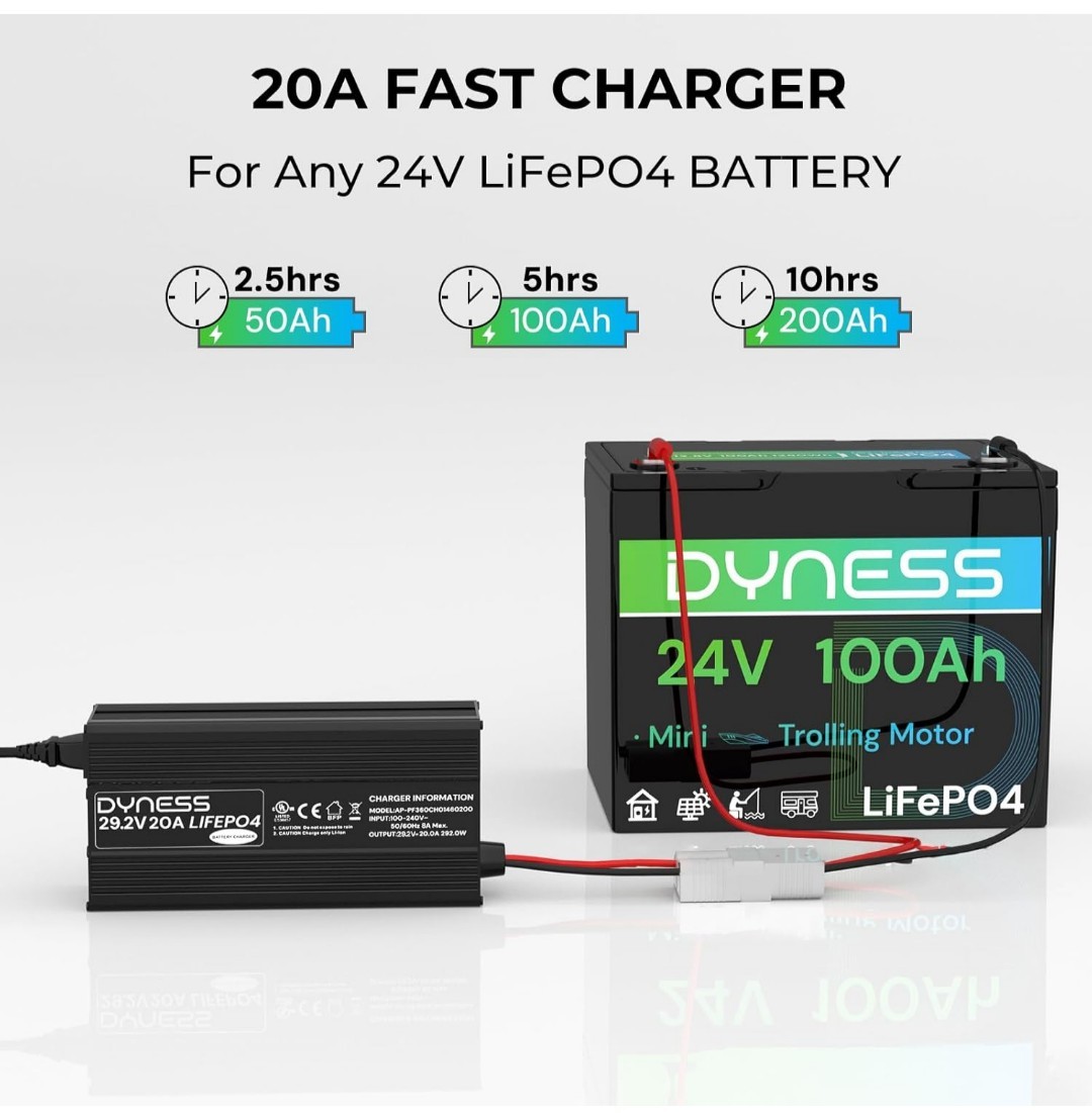 24V 20A LiFePO4 Battery Charger 29.2V Smart Charger with Anderson Connector & LED Indicator - 0V Activation & Multi-Protections for RV, Boat, Off-Grid, Solar Systems. Precise 24V LiFePO4 Compatibility & 20A Fast Charging】 Exclusively designed for 24V LiFePO4 deep-cycle batteries, this charger delivers 29.2V stable output and 20A fast charging current, significantly reducing charging time for RVs, boats, off-grid systems, and home energy storage. Supports 100-240V AC global wide input (50/60Hz, 8A max input current) 【0V Activation & 3-Stage Smart Charging】 Equipped with a precharge mode to reactivate deeply discharged (even 0V) or idle "sleeping" batteries, extending their service life. Automatically switches between 3 charging stages: Precharge → Fast Charge (constant current) → Constant Voltage. It shuts off automatically when the current drops to the set value, preventing overcharging damage. 【Durable Aluminum Alloy Design & Portability】 Crafted with oxidation-treated aluminum alloy housing, featuring high hardness, anti-oxidation, and non-fading properties. Excellent thermal design ensures efficient heat dissipation for long-term stable operation. Compact size (8.46×3.94×2.13 inches / 215×100×54mm) and lightweight (1.3kg/2.87lbs) make it easy to carry and store for outdoor adventures. 【Multiple Safety Protections & Stable Connection】 Built with 4 core safety safeguards: over-temperature, output short-circuit, reverse polarity, and output over-voltage protection, avoiding risks from faulty operations. Equipped with a 50A Anderson Connector for firm and stable connections, ensuring smooth output during high-current charging. Simple wiring (positive to positive, negative to negative) for hassle-free use.