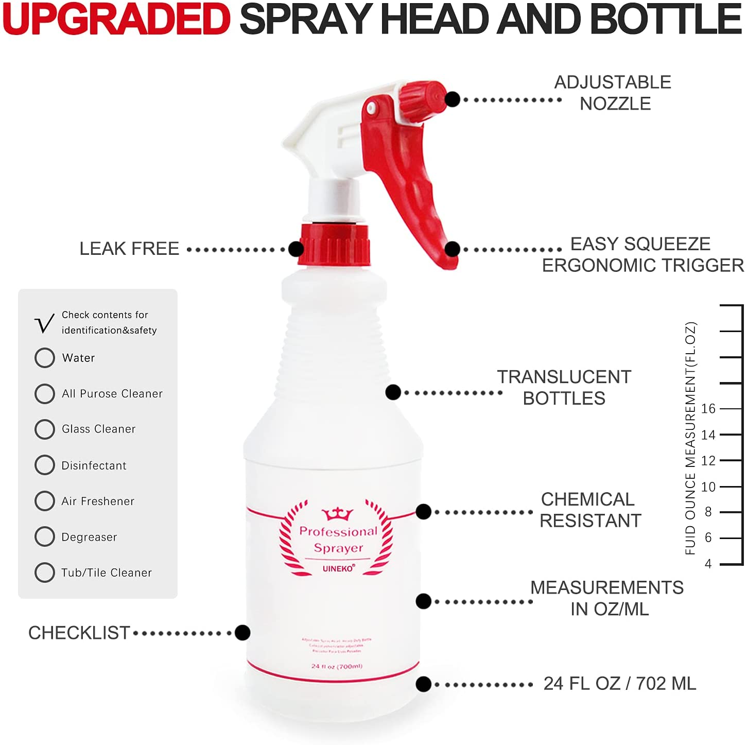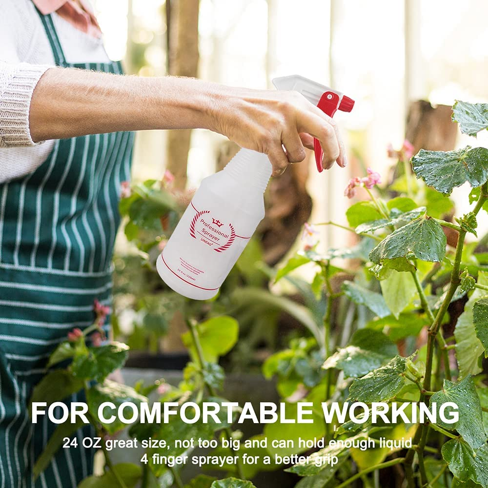 FOR YOU Plastic Spray Bottle (4 Pack, 24 Oz, All-Purpose) Heavy Duty Spraying Bottles Leak Proof Mist Empty Water Bottle for Cleaning Solution Planting Pet with Adjustable Nozzle and Measurements FEATURES ADJUSTABLE NOZZLE - From a fine mist to a solid stream, the sprayer can be easily adjusted to suit your needs. Be prepared to tackle any job with a simple twist of the nozzle! Avoid waste with our extra-long tube that'll spray every last drop out! CHEMICAL RESISTANT - The heavy duty 24 oz (about 700 ml) sprayer bottle is chemically resistant to hold up against harsh chemicals and solvents. On the side of each bottle is a checklist to stay organized and remain informed as to what the bottle contains. (Also comes with labels to meet your need) UPGRADED SPRAY HEAD & LEAK PROOF - Our sprayer features a long lasting polypropylene spray head, tight and secure cap closure, internal cap gasket, 302 stainless steel spring and a precision valve and piston, for a no clog and no leak experience; A proven and reliable no leak venting system primes quickly and stays primed. HOUSEHOLD-COMMERCIAL-INDUSTRIAL USES - Our spray bottles for multi purpose uses. Use them for cleaning solutions around the house, bleach spray, pet / cat / dog training, lawn and garden, misting and watering plants, succulents, herbs, ironing, laundry, car detailing, janitorial. Make your own homemade diy cleaner mister or just use with water to cool yourself. BETTER TRIGGER DESIGN - The unique design 4-finger trigger makes your fingers rest easily on it and the bottle fit comfortably in your hand, eliminating hand fatigue; Adjustable red nozzle turns easily letting you switch from mist, stream or to off; Pull trigger has a short effortless squeeze reducing finger fatigue. Product Description This essential set of four, 24oz spray bottles is fantastic for both home and commercial use. The adjustable spray nozzle coupled with the original 100% no-leak mechanism will set off your cleaning or gardening tasks to a perfect start. Buy economy sized liquid cleaning products in bulk for less and decant the contents into these trusty home use bottles. The 24 ounce capacity plastic bottle is perfect for all natural household looking to create their own cleaning recipes for a healthier home. Try a homemade drain cleaner or air freshener, dusting spray or furniture polish! Keeping a few labeled bottles handy around the house enabling you to use for DIY cleaners to clean windows, mist plants, or spritz over bread dough before baking… whatever it is you decide to fill these bottles with, you are sure to get hooked! Our professional spray bottles is extremely sturdy and comes with the following 5 unique features: Adjustable Nozzle 24oz Perfect Size Chemical Resistant Unique Design 4-Finger Trigger Measurements ADJUSTABLE NOZZLE Easily adjust between 3 trigger settings including mist, stream and off by simply turning the nozzle. CHEMICAL RESISTANT Sturdy material makes sure that the bottle doesn’t deteriorate due to chemical exposure or harsh substances. DESIGN FOR COMFORTABLE WORKING 24oz great size, not too big and can hold enough liquid; 4 finger sprayer for a better grip HOUSEHOLD/COMMERCIAL/INDUSTRIAL USES Our multi purpose spray bottles can be used for cleaning solutions, grooming, planting and more. PACKAGE INCLUDE 4 * Plastic Spray Bottles 1 * Label (with 9 labels) Note: If the liquid contains powder, it may cause the nozzle or the tube to become clogged, so it is recommended to shake the liquid fully evenly before use. Ensure the cap is screwed on tightly. The bottles are resistant to leaking, but it's best to avoid leaving them on their sides when not in use. Item model number UKHK002-USAS1 Capacity 700 Milliliters Number of Items 4 Country of Origin China Theme household and gardening Batteries Included? No Unit Count 4.0 Count Batteries Required? No Product Dimensions 2.36"W x 4.72"H Material Polyethylene Terephthalate (PET) Plastic Is Discontinued By Manufacturer No Included Components funnel Reusability Reusable Item Package Quantity 1 Item Weight 0.01 ounces Manufacturer Airbee Special Features Adjustable,Sturdy Special Feature Adjustable,Sturdy Part Number UKHK002-USAS1 Color Red Shape cylindrical Material Type Free All Other Materials Free Brand Uineko Product Care Instructions Hand Wash Only Size 24 Oz, 4 Pack 4.72 "h x 2.36 "h. Weight: 0.01 oz PAYMENT We accept all payments via Ebay using Credit Cards , PAYPAL , Apple Pay and many others SHIPPING We are always working hard to ensure your package arrives as soon as possible. Please understand that some factors like weather, high postal traffic, and the performance of shipping companies are outside of our control. DELIVERY & RETURN POLICY We offer a 30-Day Return Policy on items in which you are not completely satisfied with. You have the option of a full-refund or an exchange of the item. No returns are available on items shipped outside of the USA.